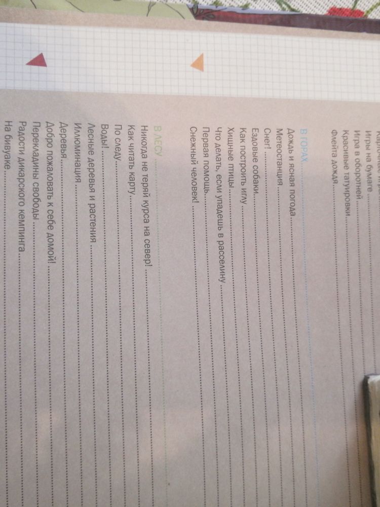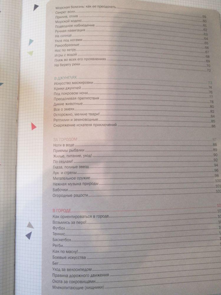 шалаш, распознавать следы животных, разжигать костёр, чинить велосипед, грести на плоту, читать карту, материть лук и стрелы, делать водяные бомбы и т. д. Хотела отложить до школы, 7+,но сын увидел и попросил почитать. Масса информации, читается легко, бумага толстая, иллюстрации приятные для глаз, в пастельных тонах. Содержание разбито на разделы:Дома, в горах, в лесу, на море, в джунглях, за городом, в городе. Есть оригами, морской бой, карточные игры, первая помощь..... Всем советую!!!! Текст мелковат, но компенсируется обилием информации по каждому вопросу!