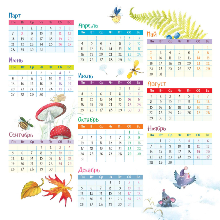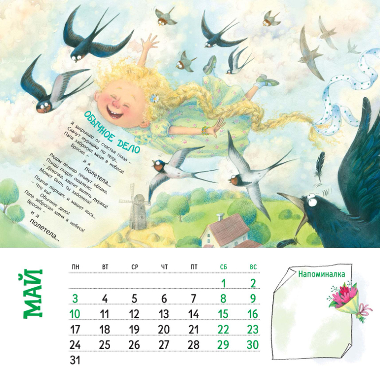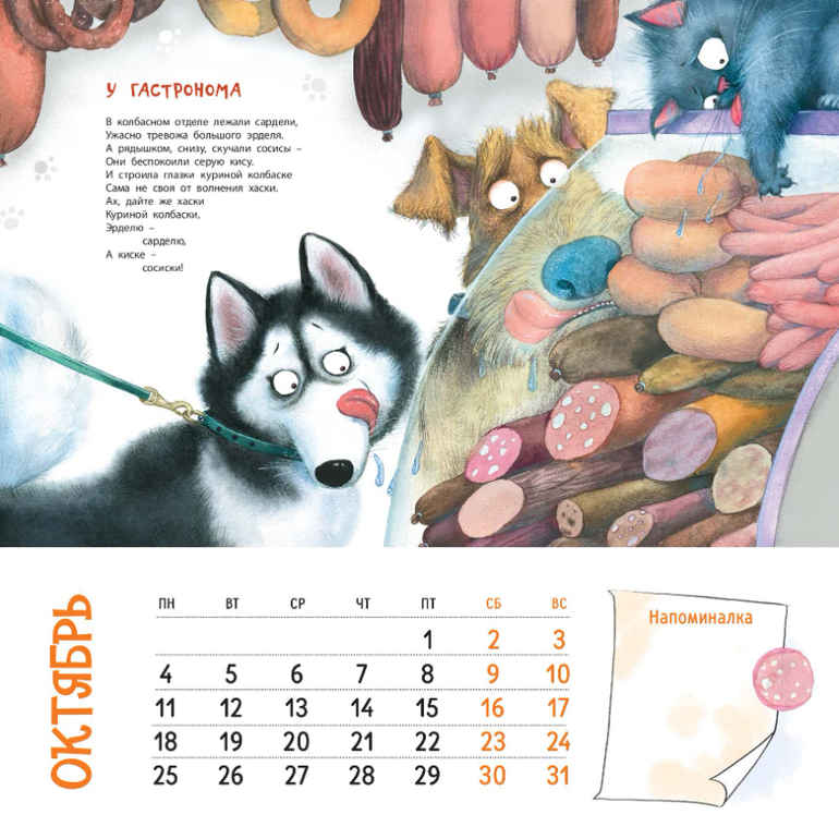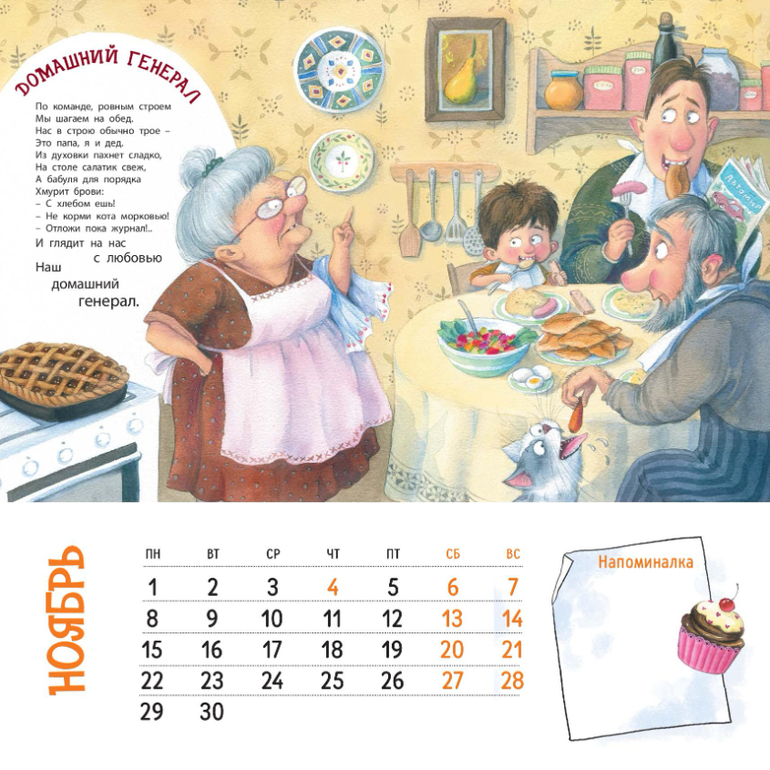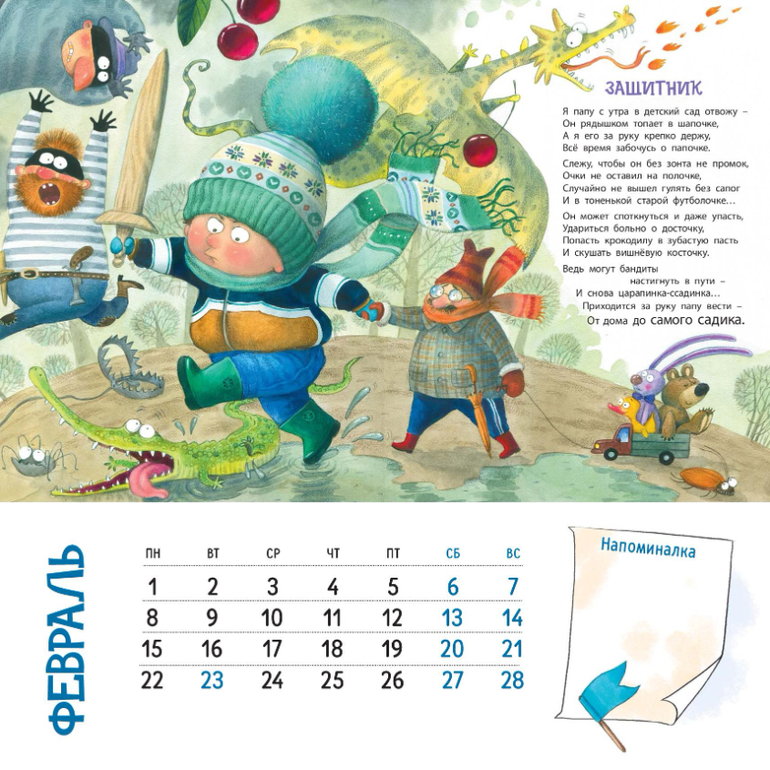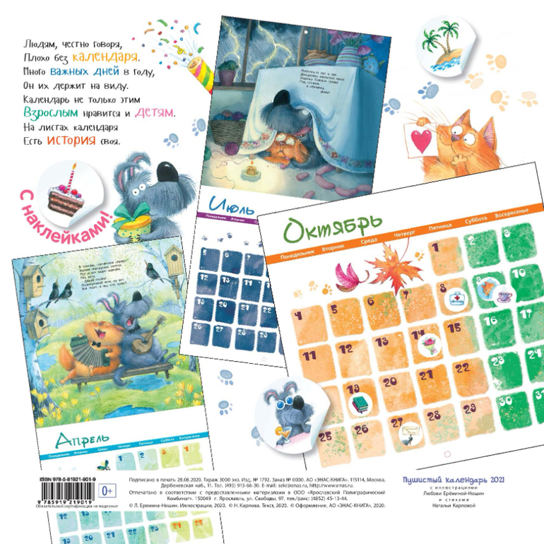 Весёлый настенный календарь на 2021 год создан из чудесных детских стихов Натальи Карповой и Ксении Валаханович и очаровательных иллюстраций Любови Ерёминой-Ношин к книжкам: