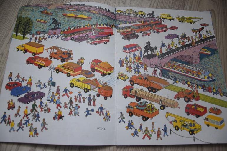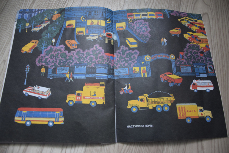 Прото картинки,но изучать машины можно хоть целый день. Больше всего нам нравятся первый разворот ("Утро"), "Зима" и "Ночь". Придумываю истории,рассказываю про машины. Саше очень нравится. Заказала ещё у этого автора "Наш гараж"
