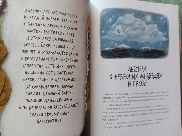 Основополагающая легенда всего цикла о Сыче и Барсуке. Почему основополагающая? Потому что, по словам Анны Старобинец, ещё до написания цикла у них в доме была семейная легенда о том, что в каждом человеке живут Сыч и Барсук. Добродушный, безобидный, доверчивый барсук и язвительный, вредный, циничный сыч. Иногда они находятся в гармонии и мирно пьют чай, но чаще начинают бороться, и от того, кто же победит, будет зависеть поведение и характер человека. О том, с чего началось это противостояние (не внутри человека, конечно, а реальное противостояние Барсука и Сычей в Дальнем лесу), эта легенда.