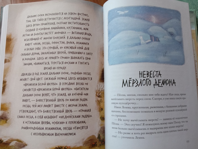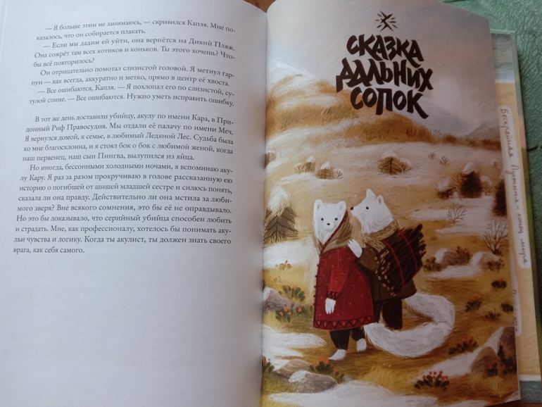 Что касается оформления. Книга издана серийно. Бумага хорошая, иллюстрации Марии Муравски, без которых я уже не представляю себе этих историй, прекрасны. Как вы уже, наверное, обратили внимание, это одна полностраничная иллюстрация-заставка к каждой местности, и одна на полстраницы в начале каждой сказки. Шрифт - как в "Богах Манго" (немного мельче, чем в "Зверском детективе").