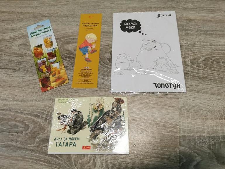 Наборы открыток и раскрасок, закладки магнитные и закладка-линейка.