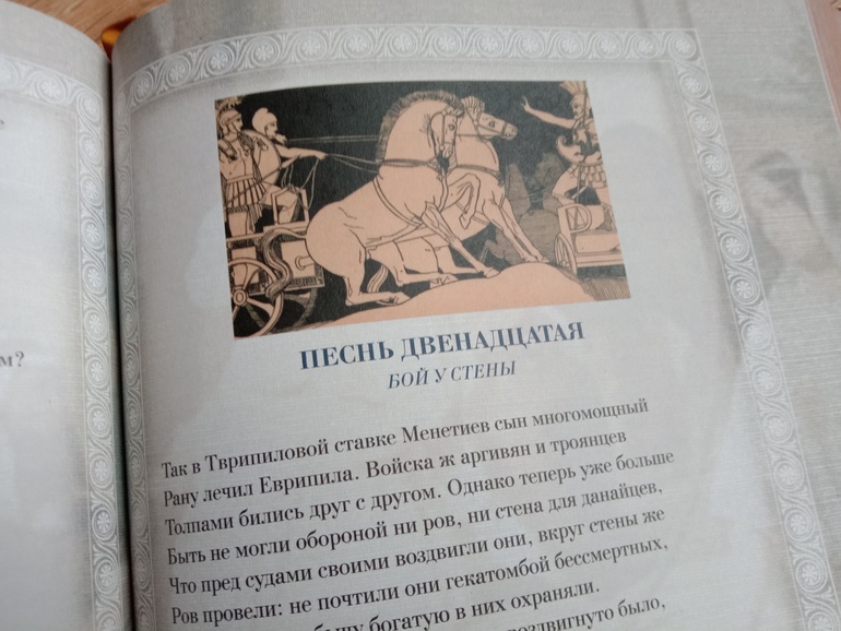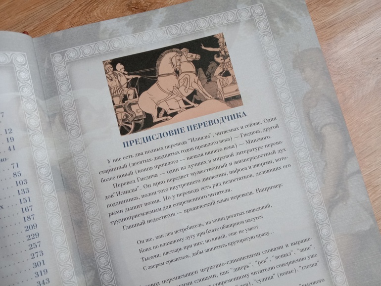"Илиада" не в классическом зубодробительном переводе Гнедича, но и не в убогом пересказе. Викентий Вересаев взял в своем переводе всё лучшее от Гнедича (потому как, если хорошо, зачем переделывать?) и по-новому перевел особенно тяжеловесное, устаревшее и непонятное. Об этом он подробно рассказывает в предисловии.