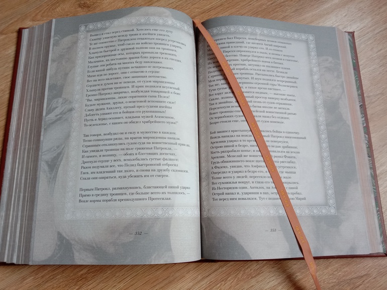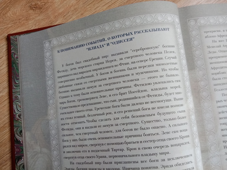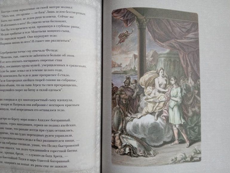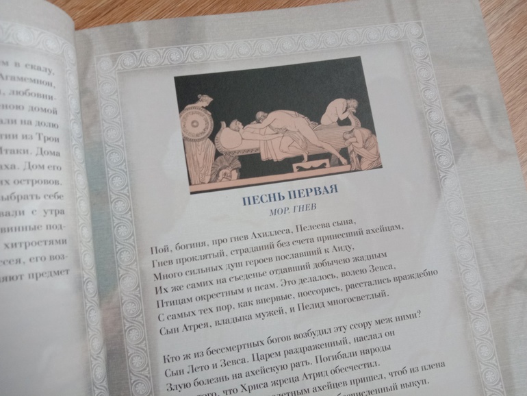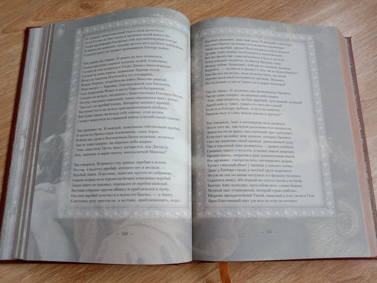 Текст напечатан на очень приятной и плотной тонированной бумаге, в рамочке. Вокруг рамочки - размытые картинки в пастельных тонах, связанные с Древней Грецией. Тонировка и картинки чтению не мешают.