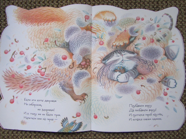 Не смогла устоять перед этой красотой, читать там особо нечего, хотя история сыну понравилась, но иллюстрации..ммм, это просто чудо какое то. Я не знаю чем художница рисует, похоже на карандашные рисунки, но такая милота, и цветовая подборка мне очень нравится ( например, забыла сфотографировать нарисованный алоэ у бабушки на подоконнике - там такой цвет у него классный). Сама история о толстенном котяре, которому было просто лень гоняться за мышами и хозяйка решила его проучить- выгнала из дома, сначала ему было хорошо, а потом он как то приуныл ( вот если честно, то очень напоминает мультик про попугая Кешку, правда там он сам ушел на улицу но всё же). Тоненькая книжечка с вырубкой формата А4, ну, да, стихотворение незамысловатое, но иллюстрации ..я помню, как хотела купить Бельчонка Тинки, как то не сложилось,а здесь по скидке глупо было мимо пройти)) По секрету скажу не устояла и во второй раз - купила с ней же новогоднюю книгу "И настал новый год")))