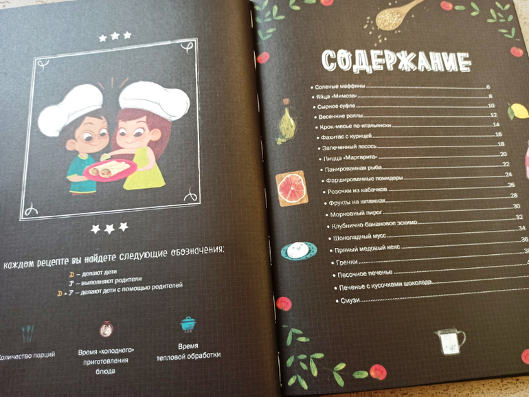 В этой книге 20 рецептов: есть совсем простые (как Яйца-мимоза), есть уже серьезные с мясом или рыбой. Ингредиентов сложных пока нам не попадалось, хотя даже майонез по рецепту надо самим готовить.
