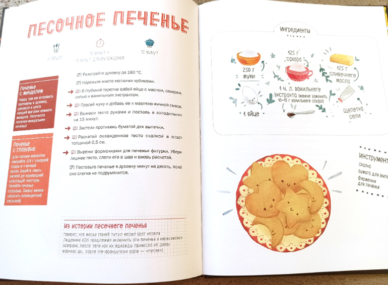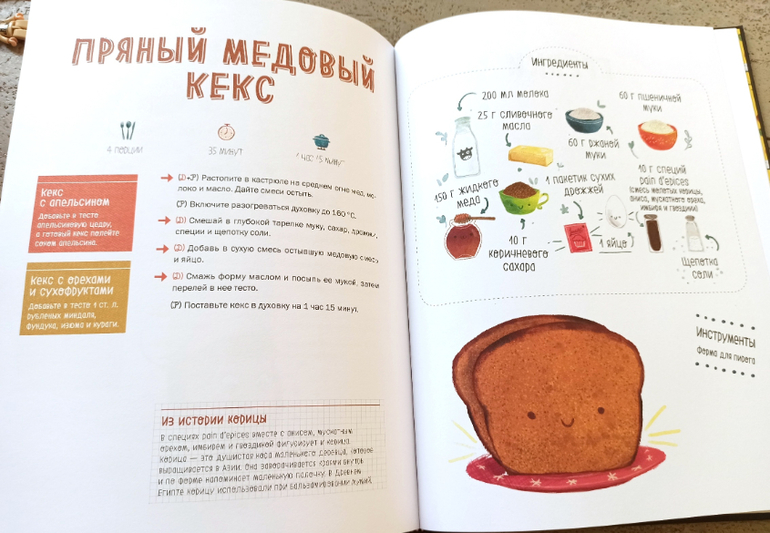 Что именно мне не понравилось: например, есть дополнительные развлекушки, вроде раскрась, сделай закладку и пр. Кого-то это порадует, для меня так это здесь не нужно. Еще не люблю шрифты типа рукописных - таким написаны ингредиенты. Само описание процесса, к счастью, нормальным шрифтом напечатано. Ну и главный недостаток: мягкий переплет, то есть книга закрывается, надо прижимать страницы.