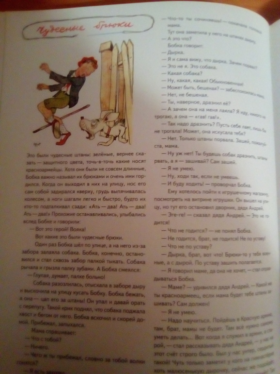 Опять же это хорошо известная "Заплатка", но опять с изменениями: про то, что зашивать свои вещи надо самому, а не маму просить, Бобке сказали не ребята, а дядя Андрей, который еще и пример привел на эту тему из армейской жизни. Вот эта версия рассказа мне как раз больше понравилась, моим полезно задуматься над тем, что в армии мама не поможет, надо больше учится самостоятельности.