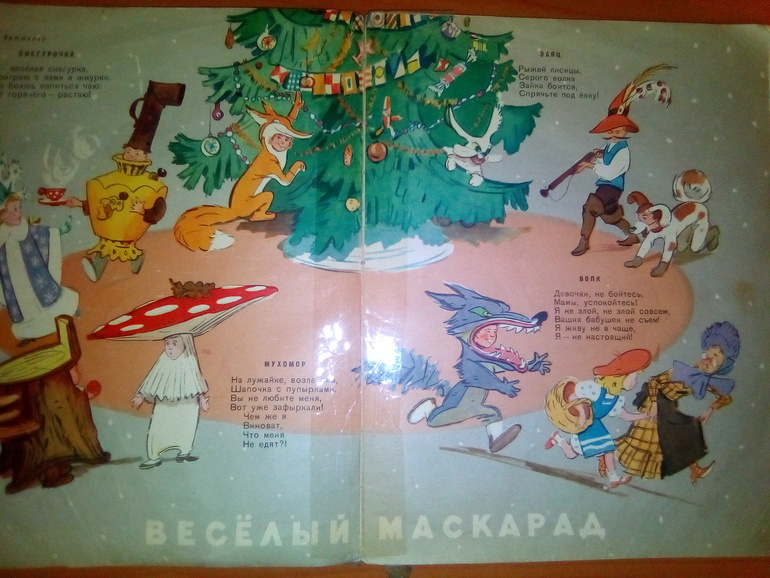Как мне понравилась первая иллюстрация, особенно дети в костюмах. Особенно костюм лисы и мухомора))). Ну и Красной шапочки, у меня в детстве был новогодний костюм Красной шапочки).