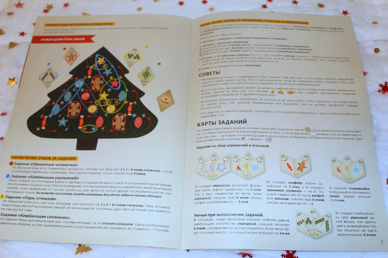 Какая же она красивая, нарядная, праздничная! Я переживала, что правила будут сложные, но напрасно, моя восьмилетка все поняла. В игре несколько уровней сложности. Мы пока играли только в самый простой. Правила хорошо объясняются, мы все поняли с первого раза, так не всегда бывает.)) Понравилось, что даже пример подсчета очков приведен. Так что, поймут как в нее играть абсолютно все. Но! Если вдруг что, то в правилах есть адрес электронной почты, в любой момент можно написать и уточнить, если возникнут вопросы.