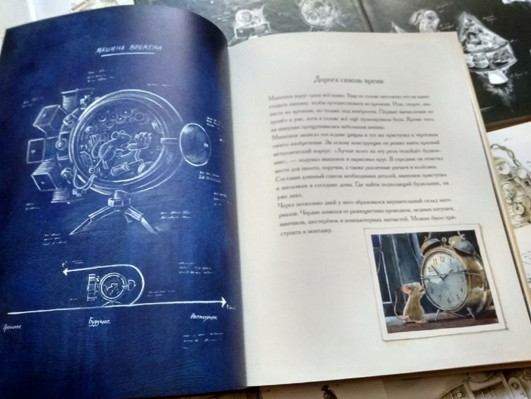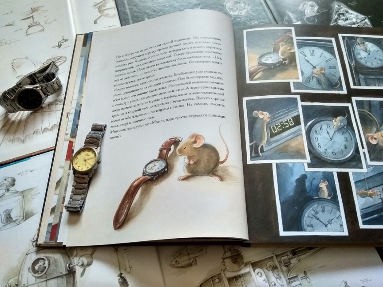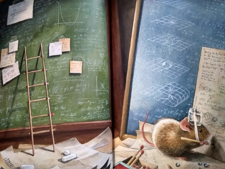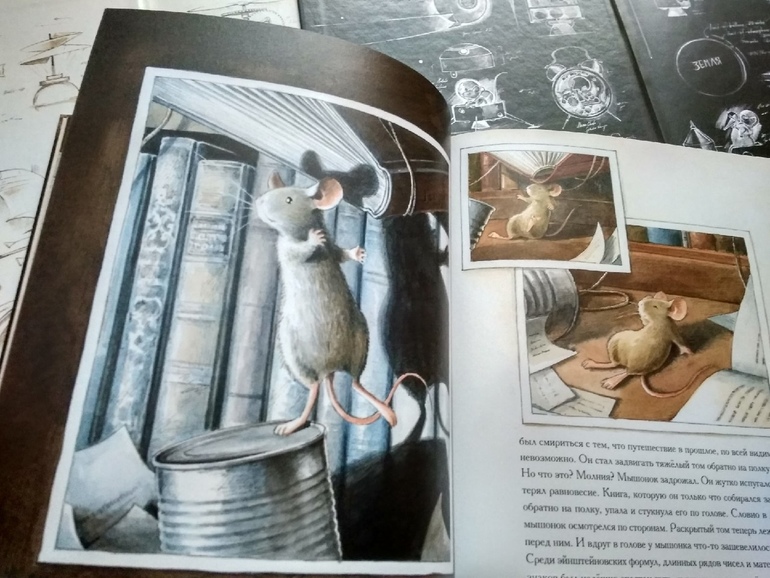 Попытки понять что такое Время приводят его на чердак патентного бюро в Берне, где мышонок знакомится с трудами Эйнштейна, а получив однажды по голове его "Теорией относительности" в твердом переплете, приобретает необыкновенную ясность мысли и конструирует машину времени. Ох уж эти ушибленные книгами (во всех смыслах) герои!