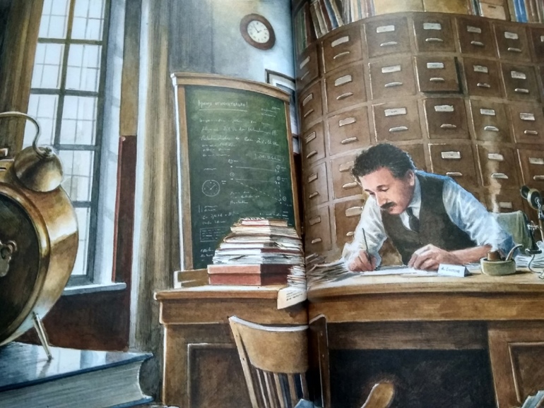 Больше всего мне в книге нравится молодой Эйнштейн. Созданный образ позволяет детям увидеть в нем обычного увлеченного человека, а не гения, родившегося сразу с седой гривой и высунутым языком. Вообще Кульманн малость недоработал. Надо было бы еще поместить в книгу аттестат Эйнштейна и развеять вредный миф о том, что в школе гений был двоечником. Автор тем самым оказал бы школьным учителям неоценимую услугу.