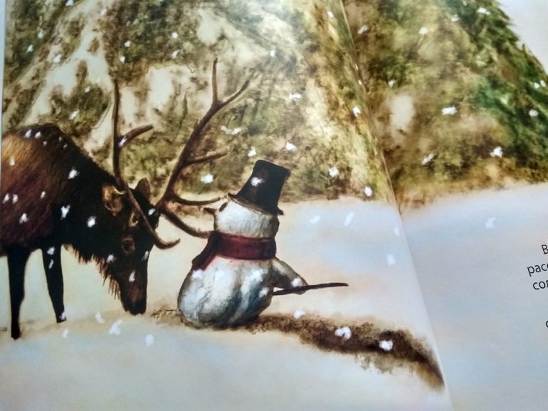 И эту книгу я когда-то спокойно пропустила - иллюстрации показались мне тогда на сканах слишком мрачными для маленьких детей. Слишком много коричневого цвета в иллюстрациях меня угнетало. И звери уж слишком реалистичны... Но все восторгались книгами Тьерри Дедье про Снеговика, отзывы были такими хорошими, а книги так быстро разлетелись, что при допечатке тиража я стала разглядывать их куда внимательнее. Мне понравилась история, прочитанная по фотографиям разворотов. И хоть в книгах про снеговиков недостатка на моих полках не наблюдается, одна только Дедморозовка (а она ведь не одна!) ими так густо заселена, что в глазах рябит, но я все же решила, что еще один совсем не помешает. Тем более столь высокохудожественно нарисованный. Тем более такой добрый и отзывчивый, с таким замечательным характером, достойным восхищения, уважения и подражания. Книга такая душевная, добрая и правильная, что читать и смотреть иллюстрации в ней - сплошное удовольствие. Каждый разворот, словно картина из галереи. И звери так реалистичны! )) И понятна она с самого раннего возраста и не перерастают ее дети достаточно долго. Может быть, как раз за счет реалистичности иллюстраций?