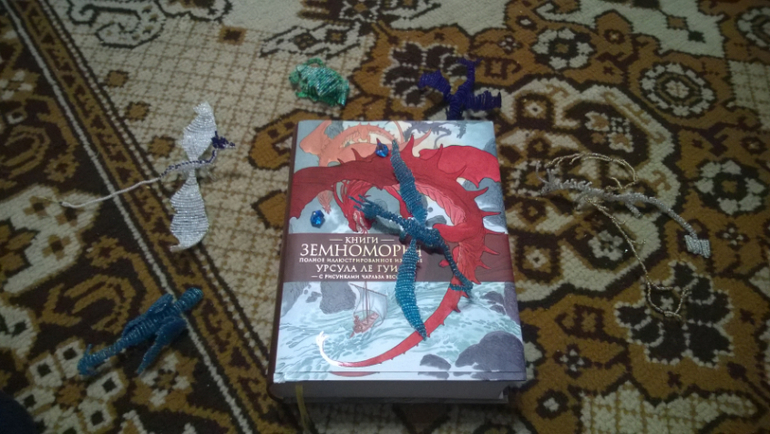 Да-да, Тёма любит драконов. Я уже говорила это? Он придумал и сплел несколько десятков бисерных драконов, сейчас вот по случаю морозов сидит дома и плетет очередного... Талмуд на 1000 страниц был в феврале прочитан за 3 недели, в декабре перечитан...