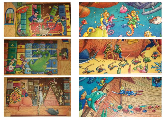 Дальше картинка-виммель. Здесь масса забавных персонажей и ситуаций. Обожаю, например, полку с книжками: «Как приумножить богатство - Как зарыть сокровище - Как найти клад - Уголовный кодекс». Или как раки в поход собрались (это уже из «морского дна»)
