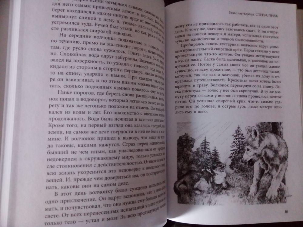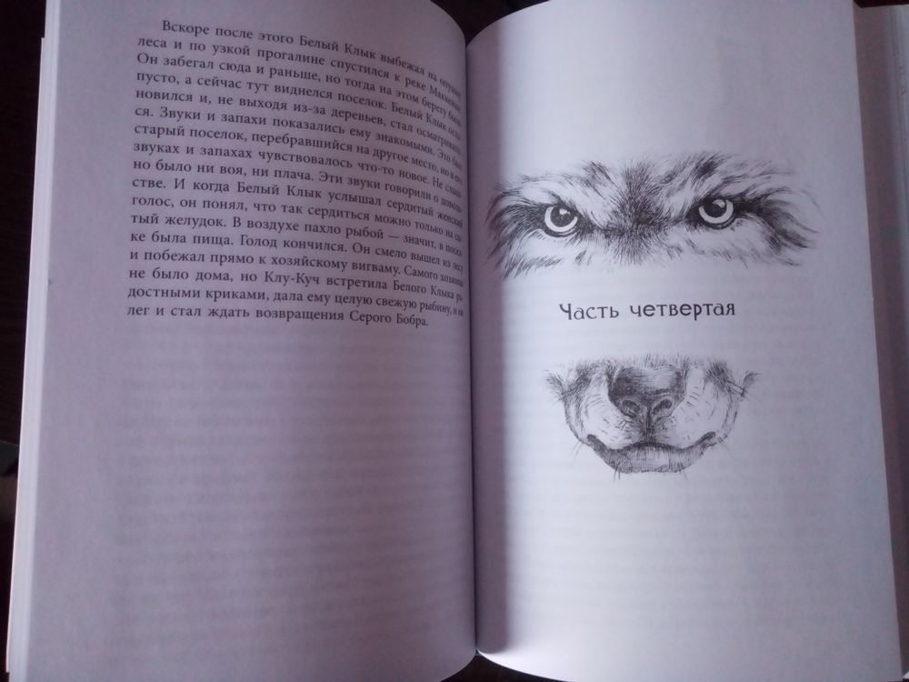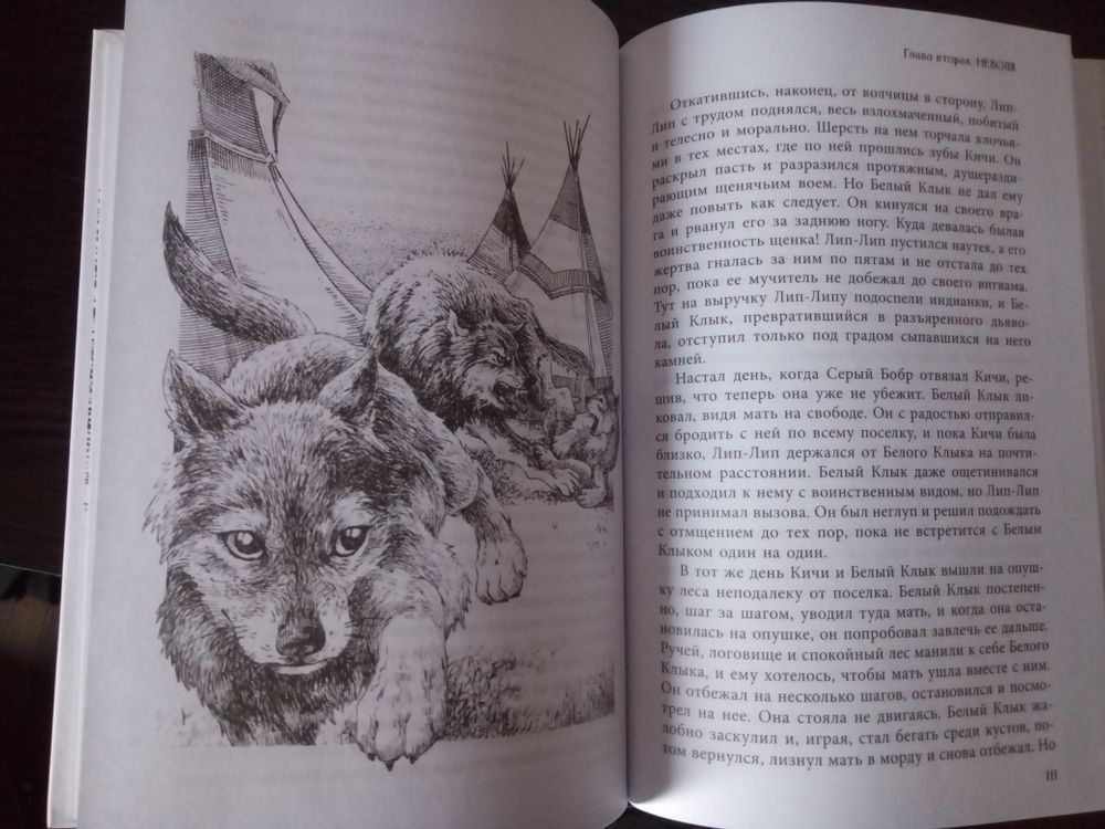 Купила у "Качелей" "Белого клыка" с ил. Степаненко Л. Всем она хороша: и шрифт, и количество иллюстраций, и само оформление частей, глав и самой книги. Сам формат лишь чуть больше стандартного. Взяла за 300р. и больше она не стоит, потому что качество бумаги очень плохое. Да, она белая, но тонкая и просвечивается насквозь! Смотрите на фотографиях.