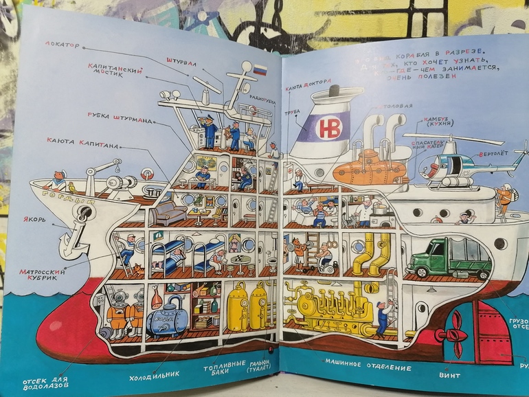 4. "Над водой, на воде, под водой" любимая книга Ярика, даже в садик её носил и всем показывал, очень благодарна девушке, у которой я её купила. Познавательно и с юмором рассказано об устройстве корабля, о морских профессиях и членах экипажа. Иллюстрации нестандартные, но запоминающийся.