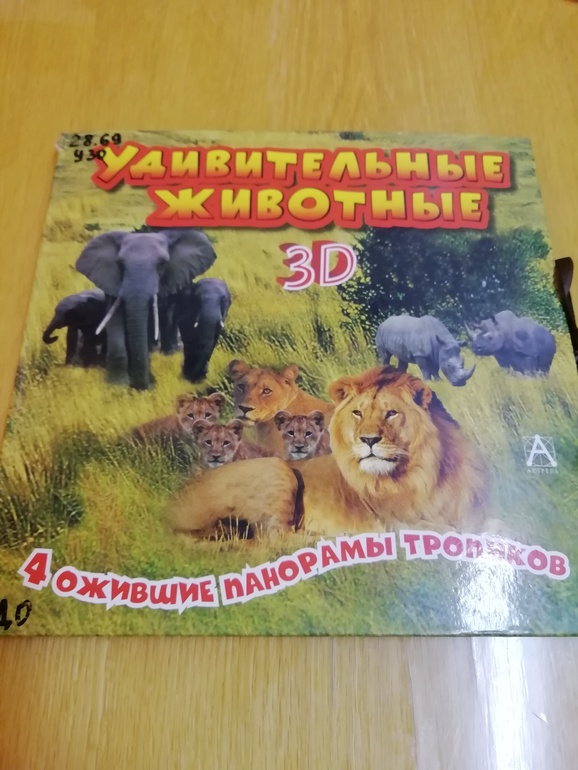 3. Удивительные животные 3-D. Ожившие панорамы тропиков. Небольшая красочная энциклопедия с панорамными разворотами и небольшим объёмом информации по представленным животным.
