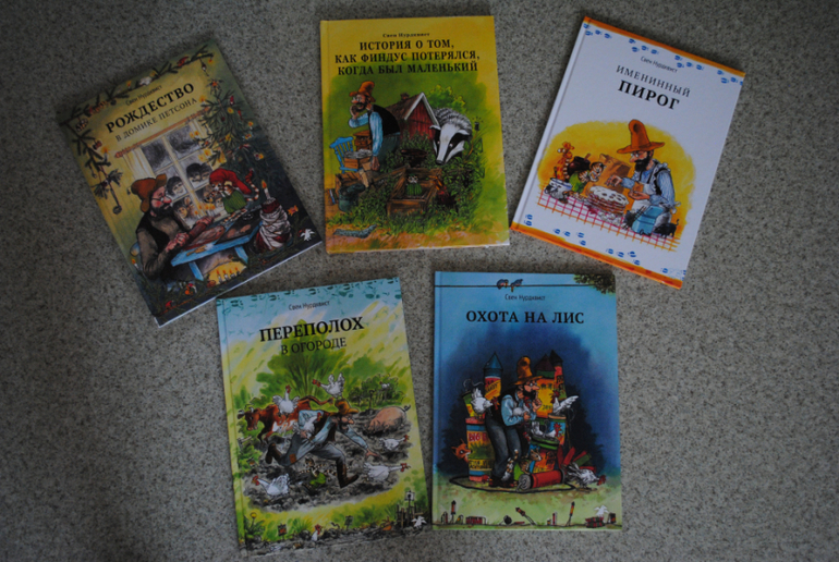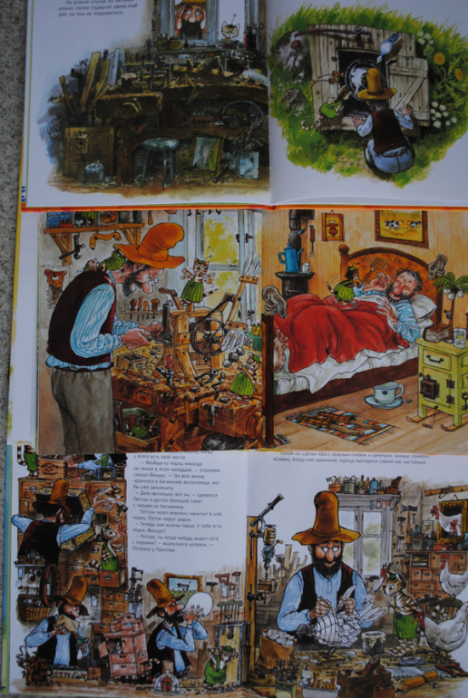 Перечитали Финдуса, всего, который дома был. Эти вот книги не забываются. Все хочу докупить основные истории, но все не получается. Книга о том, как Финдус потерялся у нас старая, другого издательства, и мне она больше нравится, чем те книги, что Белая ворона издает. Цвета в ней мягче и насыщенней. Внизу на фото 3 книги с рисунком в мастерской. В "Именинном пироге" сверху цвета блеклые, в "Охоте на лис" внизу темные. А в середине то, что надо. Но выбора сейчас нет, любим то, что есть.
