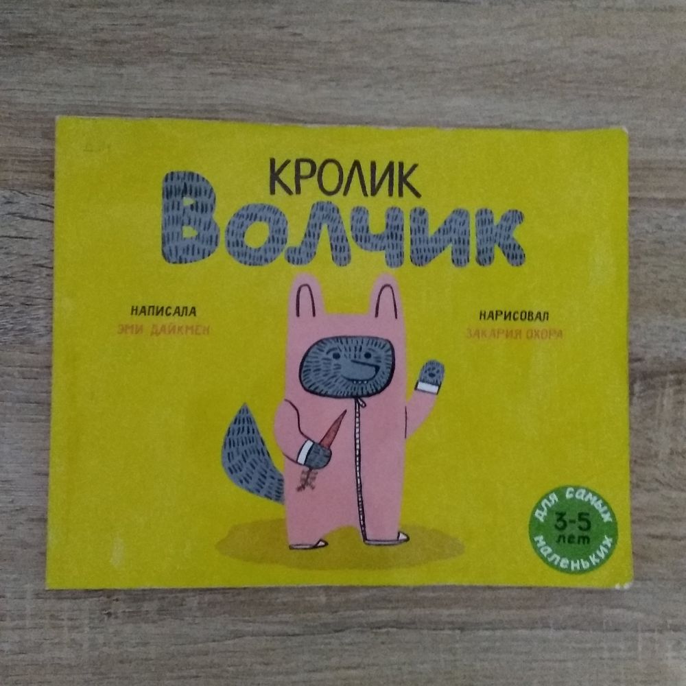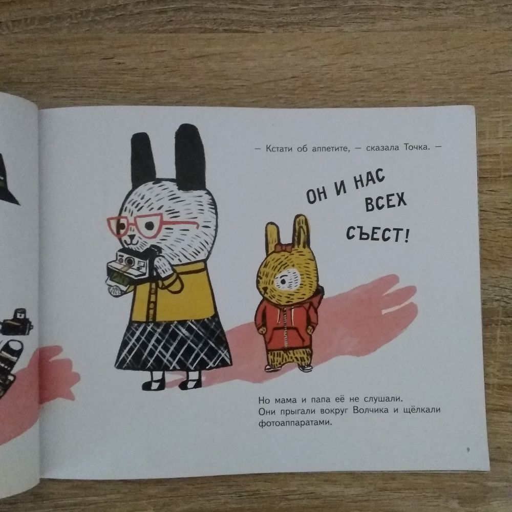 Мне совсем не нравятся картинки, да и текст простой. Но дочка готова каждый день слушать. Про маленького волчонка, которого подкинули под порог дома кроликов. Папа и мама кролики сразу полюбили его, а вот дочка Точка боялась и не верила волчонку.