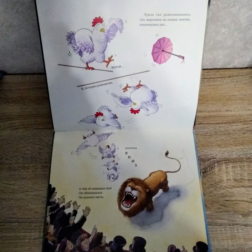 Зато следующая книга данного автора в любимое. Читали раз 6, текста не много. Про курочку, мечтающую о приключениях. И иногда ее мечты сбываются. Она побывала и на пиратском корабле, и под куполом цирка, и в клетке с другими курицами.