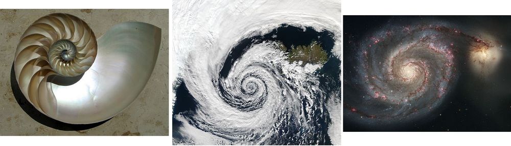(1 - разрез раковины моллюска, 2 - область низкого давления над Исландией, 3 - рукава галактики М 51 в созвездии Гончие Псы)