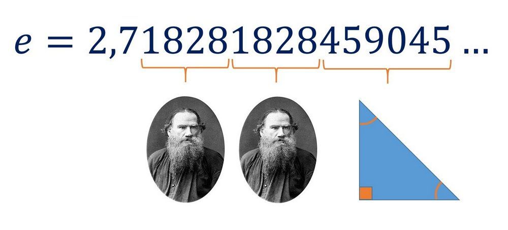 Запомнить е с большим числом цифр просто, если вам известен год, когда родился писатель Лев Толстой, - 1828. Дело в том, что он повторяется дважды после 2,7. Существует даже стихотворное мнемотическое правило: «Экспоненту помнить способ есть простой: два и семь десятых, дважды Лев Толстой». А дальше идут углы равнобедренного прямоугольного треугольника: 45, 90, 45. В результате получим: