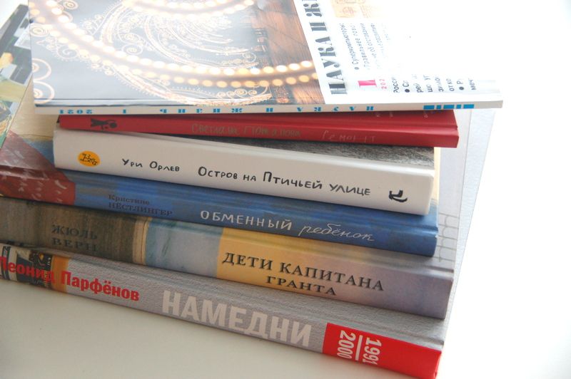 Искала в местной библиотеке книги про Шмяка и Финдуса, нашла только две, поэтому по пути из Москвы попросила мужа притормозить у другой библиотеки и забежала на пару минут. Пока библиотекарь выносила из зала еще парочку Финдусов, взяла со взрослых полок пару первых попавшихся новеньких книг, авторов которых помнила по записям в сообществе.