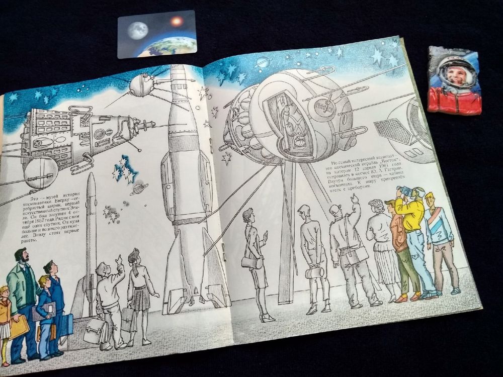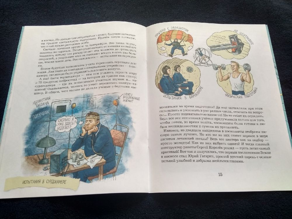 Современная книжка для меня просто дополнение к к этим стареньким. Цветные рисунки сразу понижают возрастную планку и мы читали ее с детьми вместе с разглядыванием фотографий и зачитыванием пары выбранных абзацев из более серьезных книг. Хотя именно в этой детской книжке на такую серьезную историческую тему меня совершенно не устраивают карикатурные рисунки Ольги Громовой в стиле а-ля-Огородников. Когда-то при чтении детям больше всего понравилась глава про собак-космонавтов и неподдающийся объяснениям ученых факт того, что Белка со Стрелкой дружно облаяли пролетавший мимо американский спутник. Я же всегда с особым нажимом читала главу о подготовке космонавтов - ну профдеформация, я знаю, но полезно же для детей )