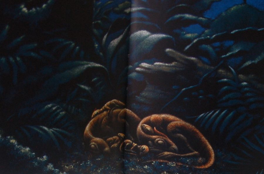 Автор и художник - немецкий писатель Дитер Висмюллер. Иллюстрации мне очень понравились! Местами как будто немного размытые, они очень хорошо передают атмосферу динозавровой эпохи, как я себе её представляла. Буйная растительность, исполинские деревья, багрово-фиолетовые закаты, зеленые с охрой рассветы… книга погружает в эру, когда на земле царствовали эти ящеры.
