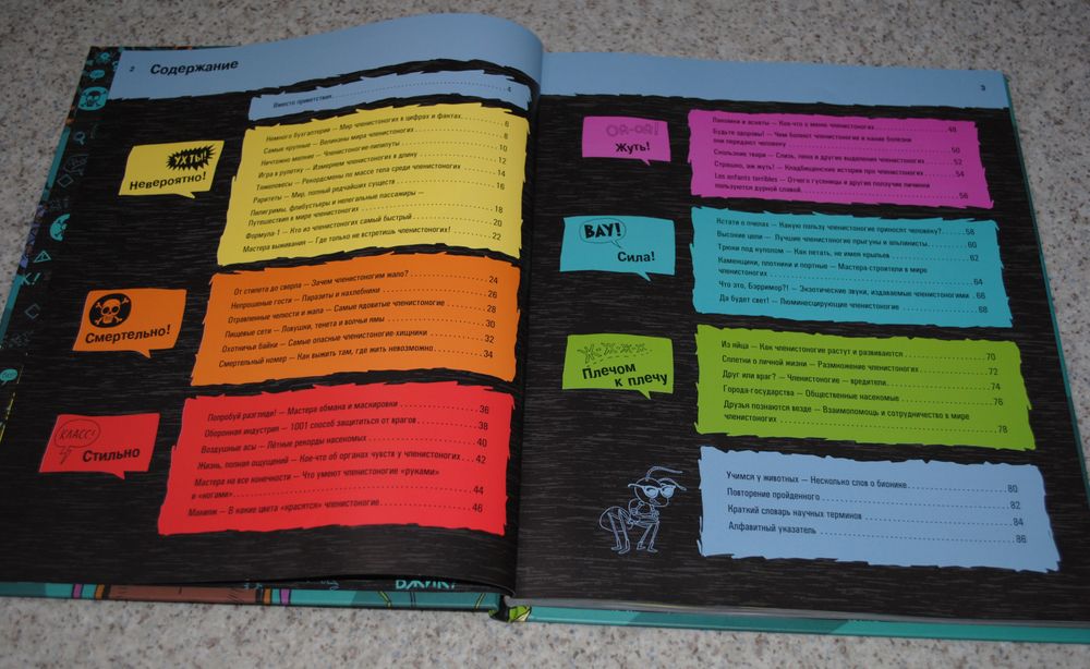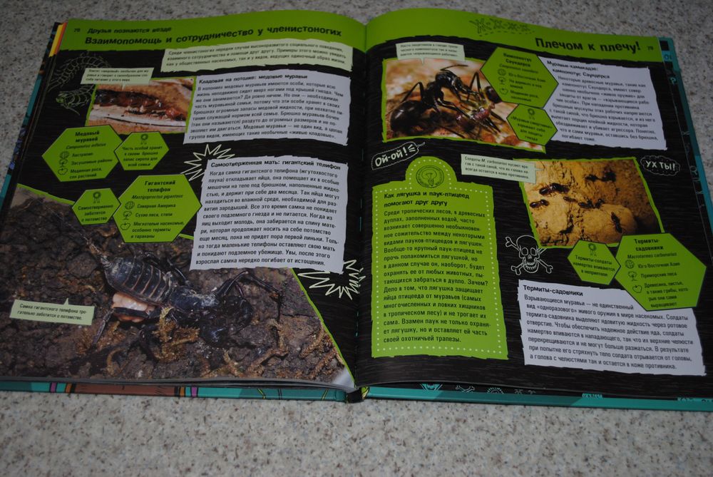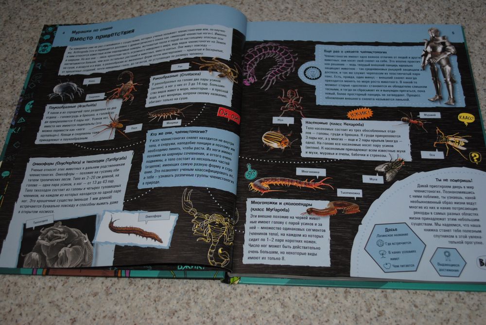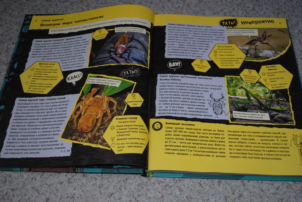 Каждый раздел с рамками своего цвета. Но интересно. Тёма очень удивлялся, что какая-то оса (забыла, какая) по размеру меньше инфузории - туфельки. А ведь инфузория - одноклеточное!