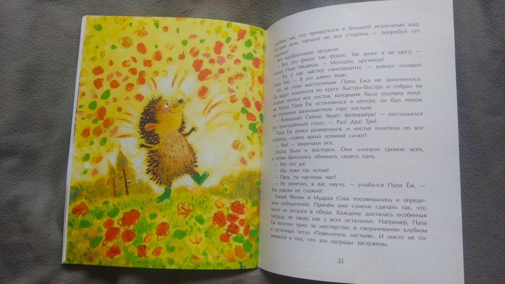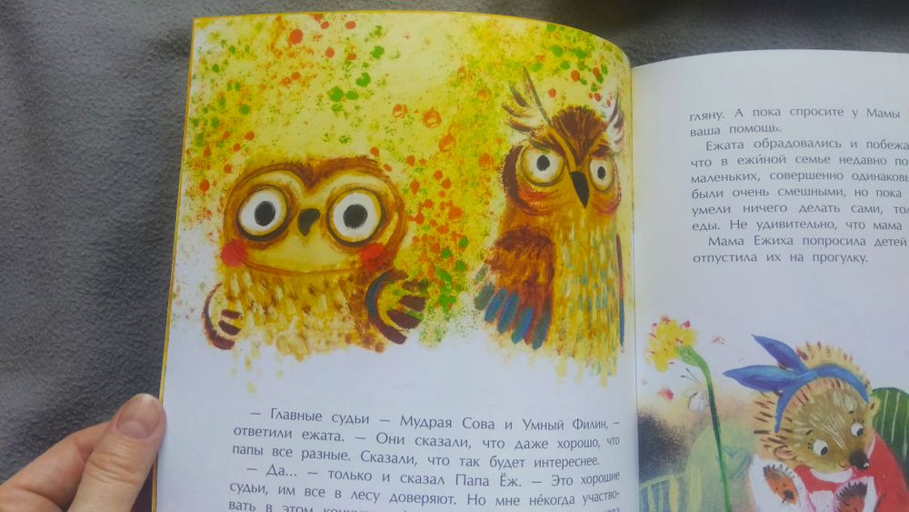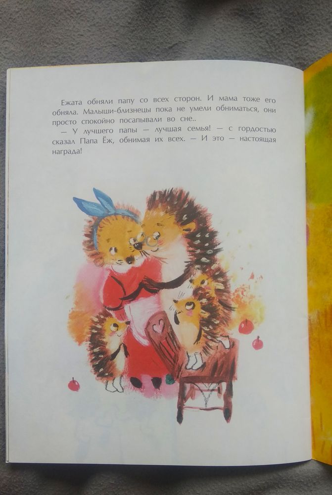 . Наша новая добрая сказка. Очень добрая и хорошая сказка, о том как ёжики переживали за своего папу, он же не такой сильный как медведь и не может показывать фокусы как папа лис. Но тут папа ёжик - это мечта любой мамы, который и детей спать уложит и старших деток уговорит помочь маме! Честно - покупаем эту книгу и даём читать папам, как пример, показать идеального папу - отлично! А для ребенка папа там самый лучший и любит семью и маму! Конец как и в любой детской книге замечательный. А мне понравились судьи - Сова и Филин.