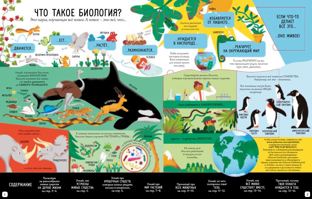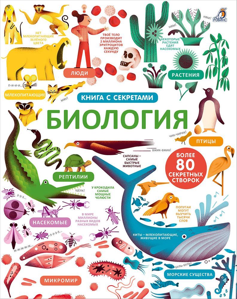 В «Биологии» издательства «Робинс» под более чем 80 секретными створками спрятаны удивительные факты о животных, растениях, микроорганизмах и человеческом теле. Заглянув под волшебные окошки, ребенок найдет ответы на многие волнующие его вопросы.