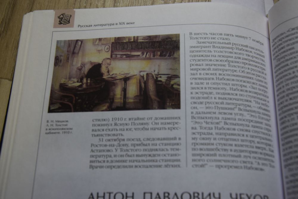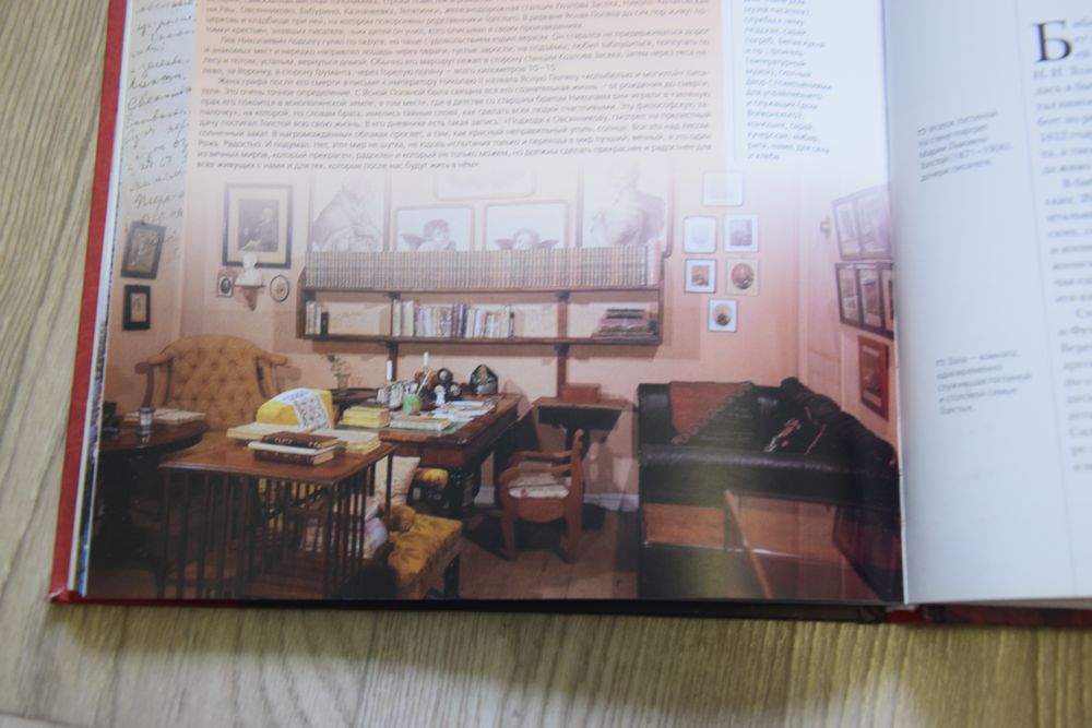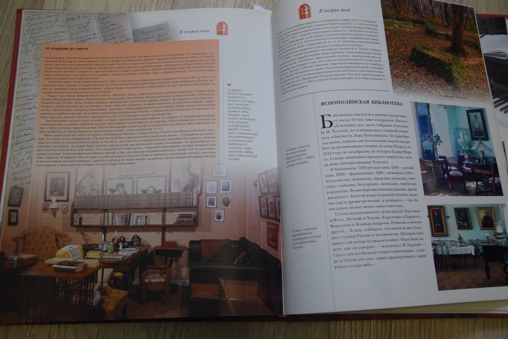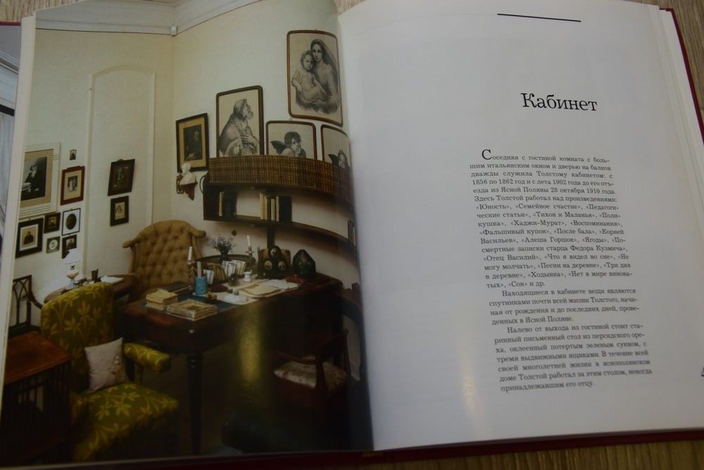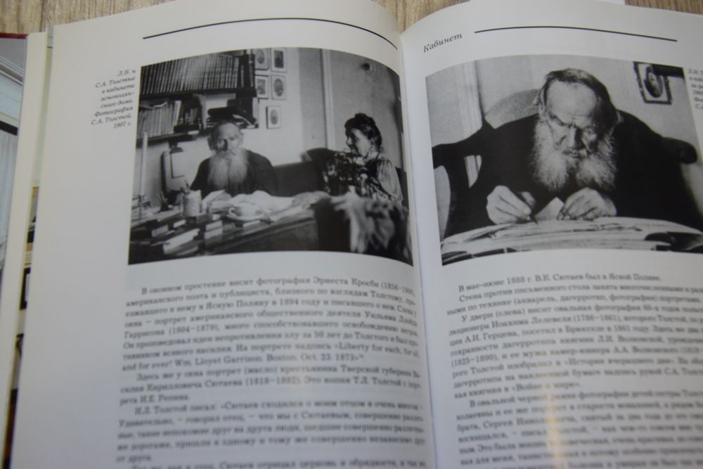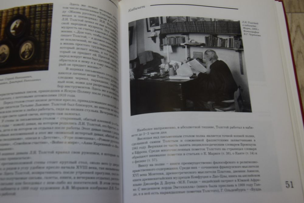 …Когда мы переступаем порог яснополянского дома, видим уже в передней березовые желтые шкафы, наполненные книгами. Книги будут сопровождать нас по всему дому. Их обилие и разнообразие говорят о напряженной умственной жизни, о широте духовных интересов Толстого.
