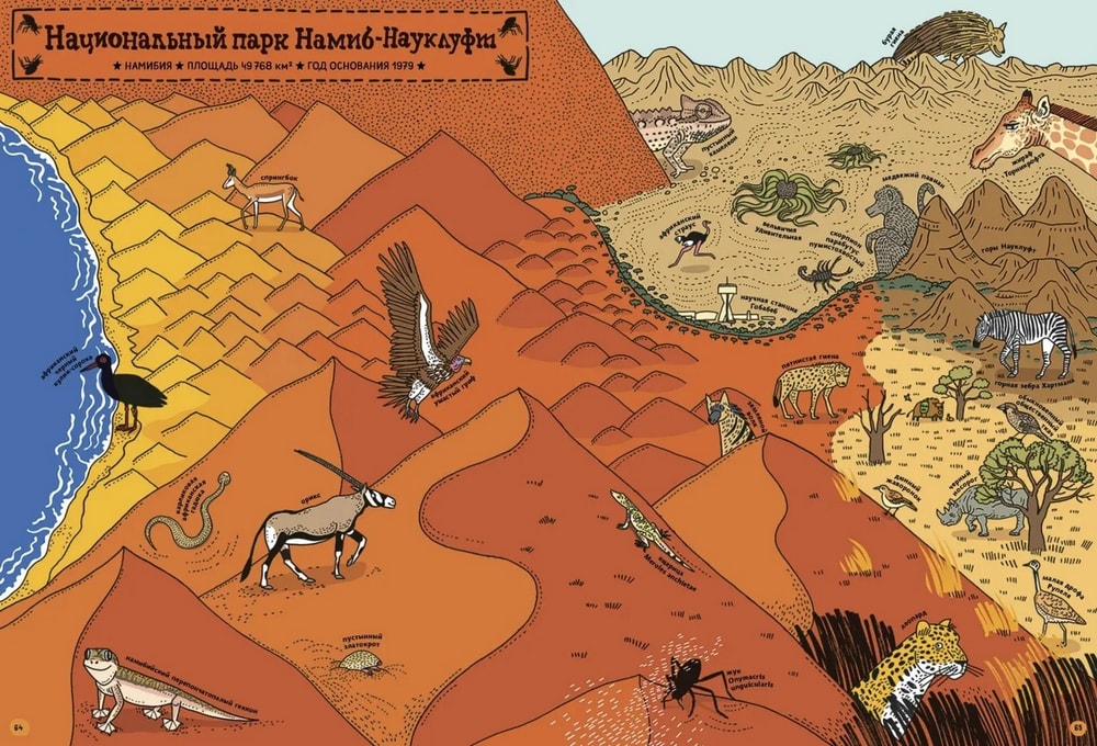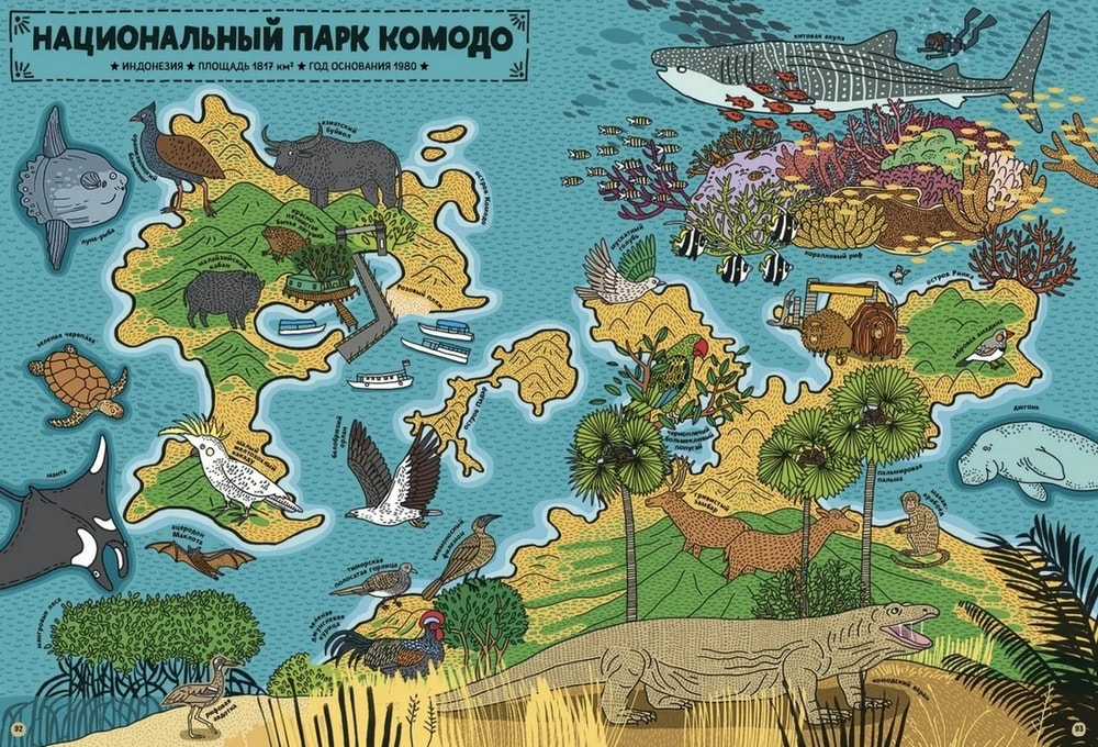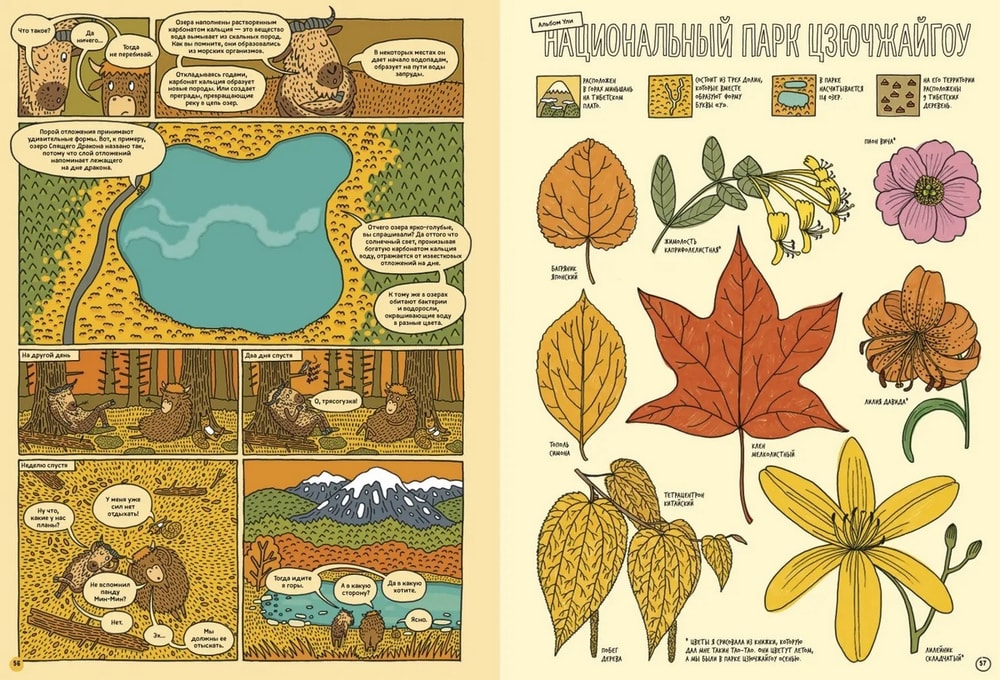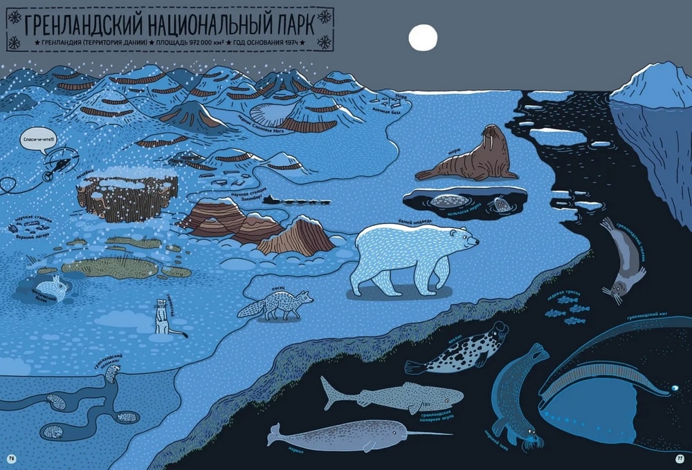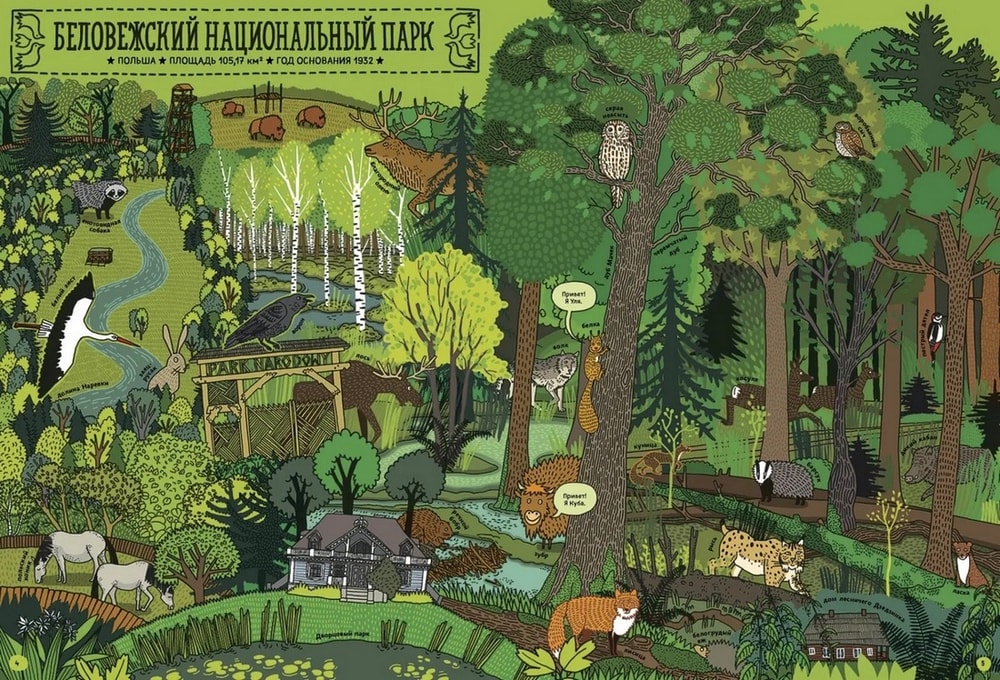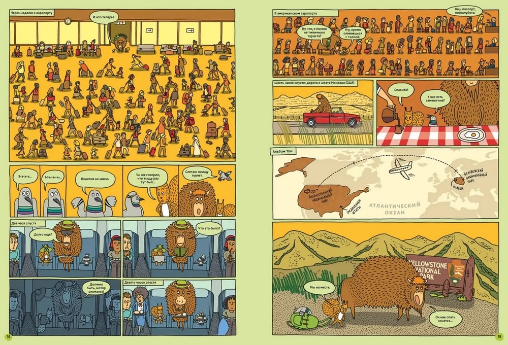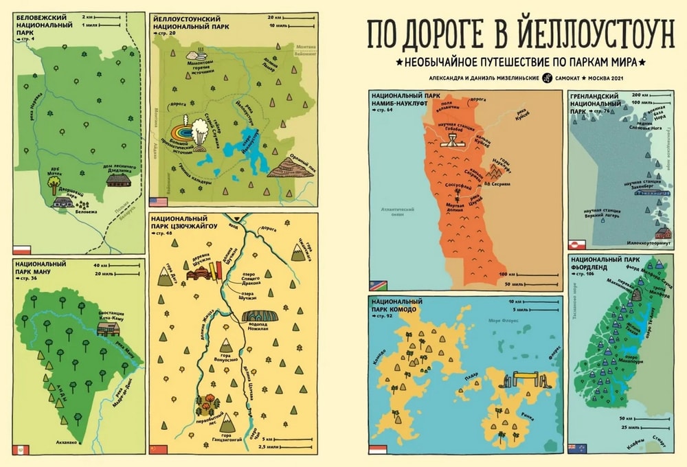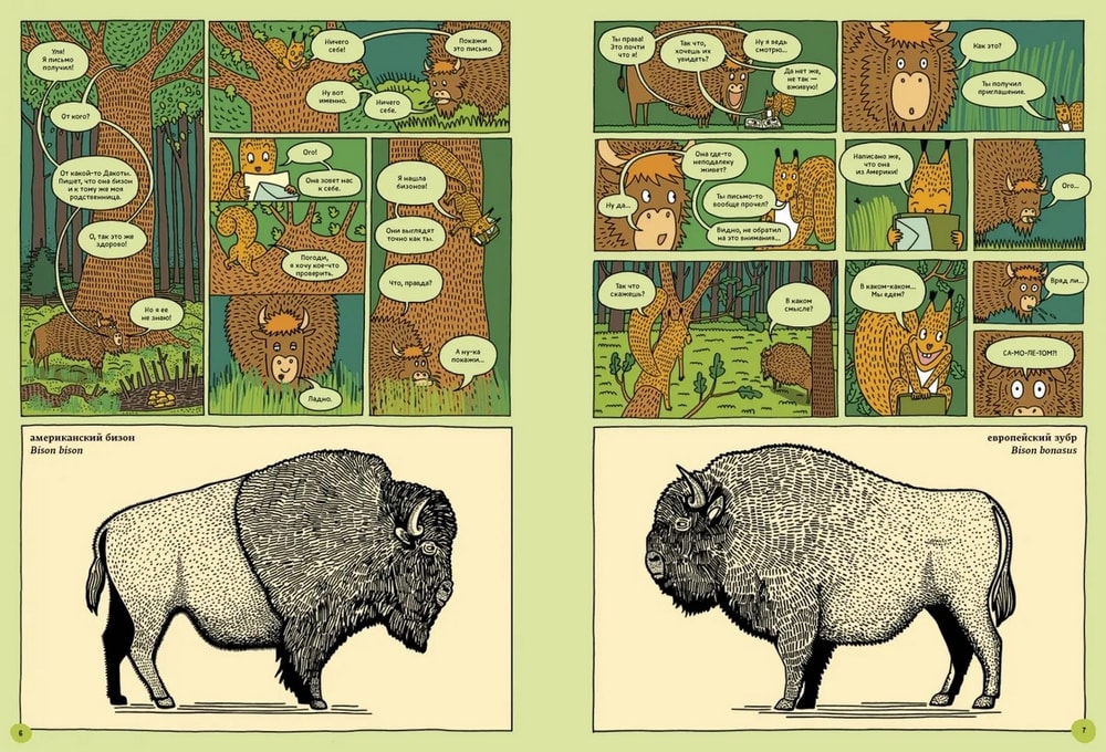 Это такая довольно толстенькая большеформатная энциклопедия в комиксах с сюжетом. Зубр Куба и белка Уля, оба родом из польской части Беловежской пущи, отправляются в путешествие по планете и посещают 7 (плюс восьмой – сама Пуща) национальных парков мира: Намиб-Науклуфт в Африке, Ману в Южной Америке, Гренландский национальный парк, китайский парк Цзючжайгоу, индонезийский Комодо, новозеландский Фьордленд и североамериканский Йеллоустоун.