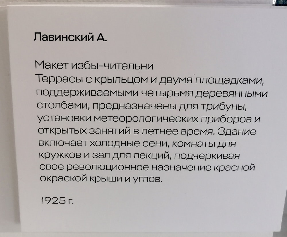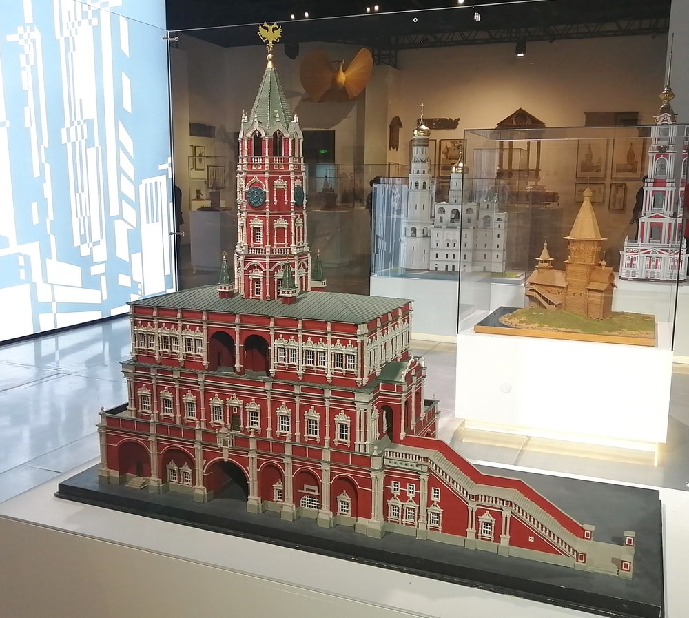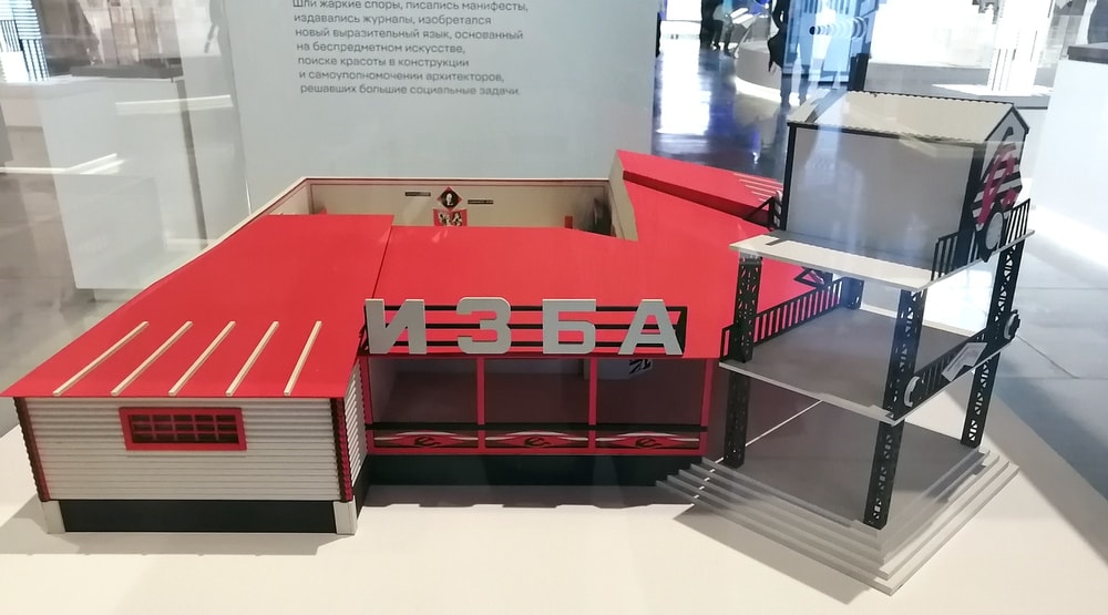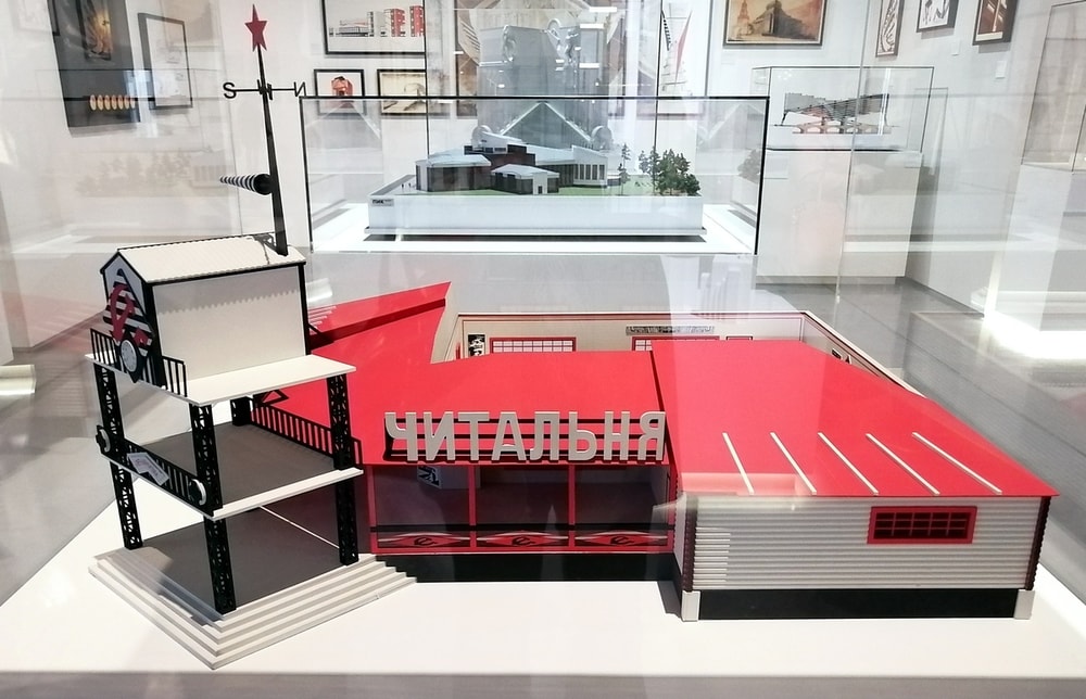 На ней представлены экспонаты архитектуры: от старинных до современных, от рисунков до моделей. Основное пространство уделено идеям советских архитекторов.