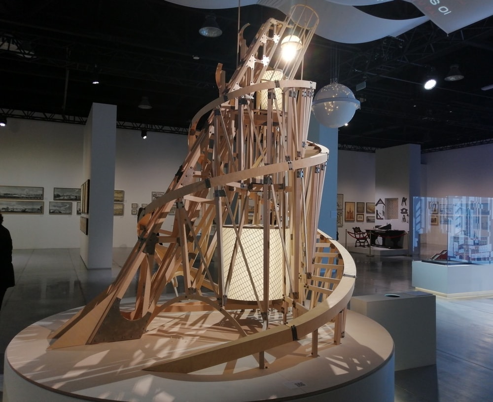 Макет башни Татлина. Это проект монументального памятника, посвященного III Интернационалу. Железный монумент предназначался для высших органов всемирной рабоче-крестьянской власти, которым предлагалось разместиться в семиэтажных вращающихся зданиях.