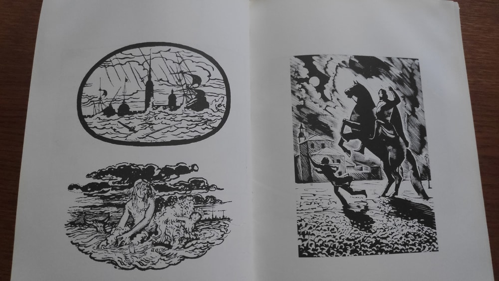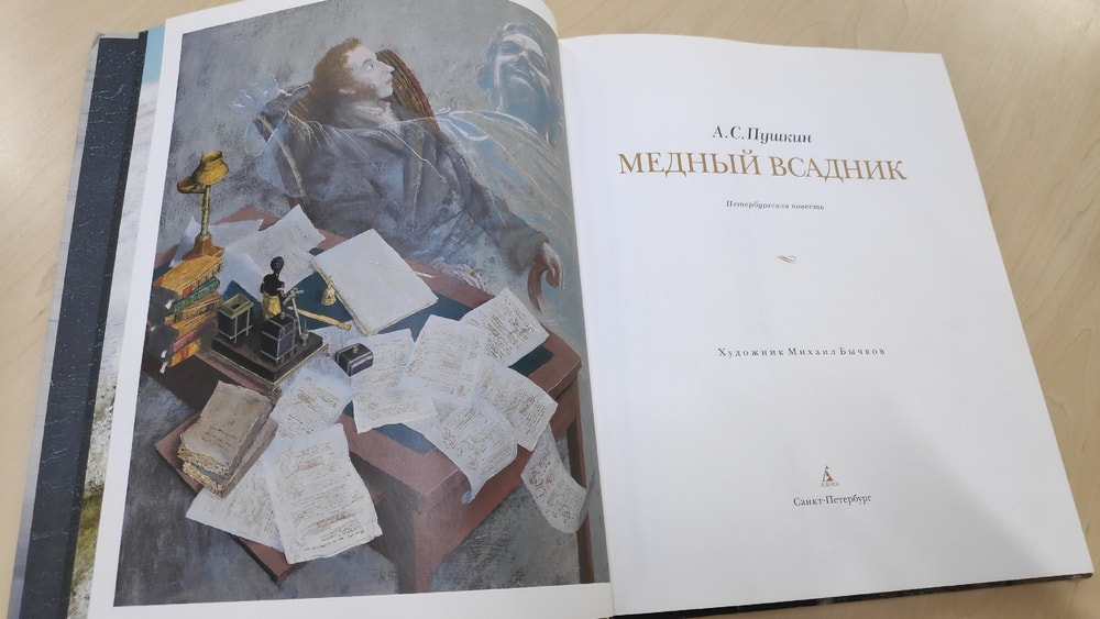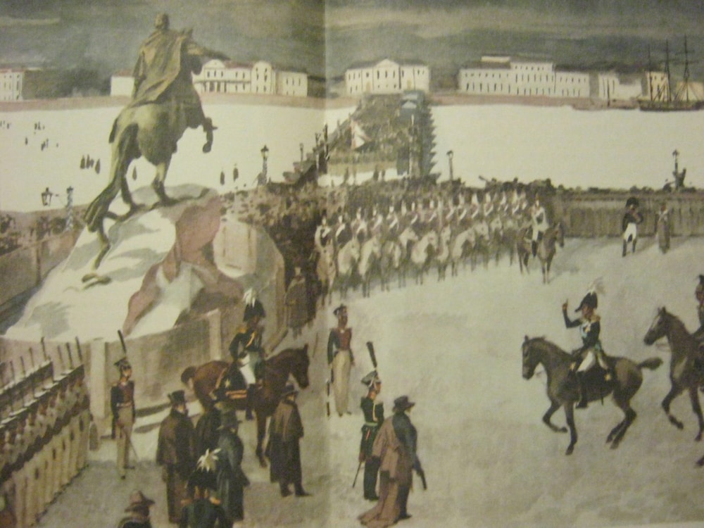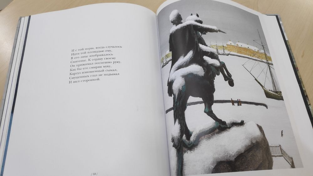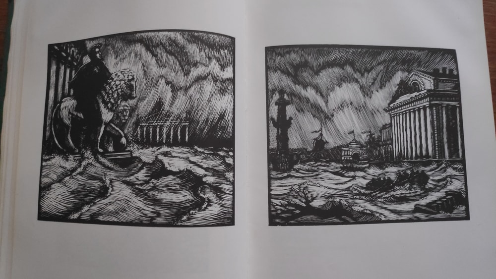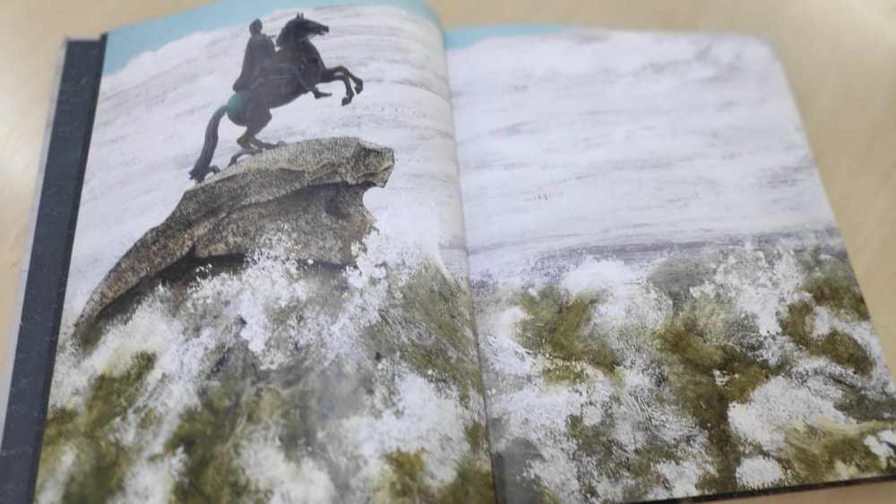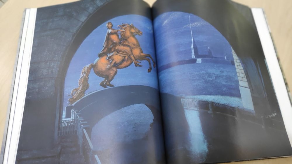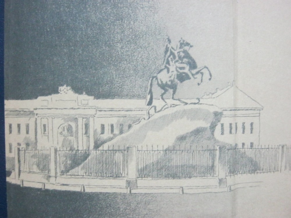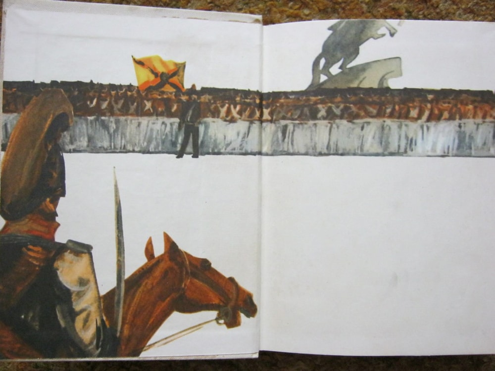 Конечно же, первым приходит в голову пушкинский Медный всадник. В разных книгах и разных ракурсах.