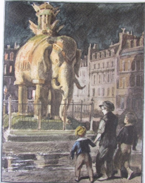 Самый запомнившийся памятник из детства, который произвел на меня огромное впечатление - слон на площади Парижа, в котором жил Гаврош. Я читала рассказ в хрестоматии, иллюстраций не помню, видимо, их не было. В моей сегодняшней книжке нет слона, поэтому пусть будет картинка из интернета: