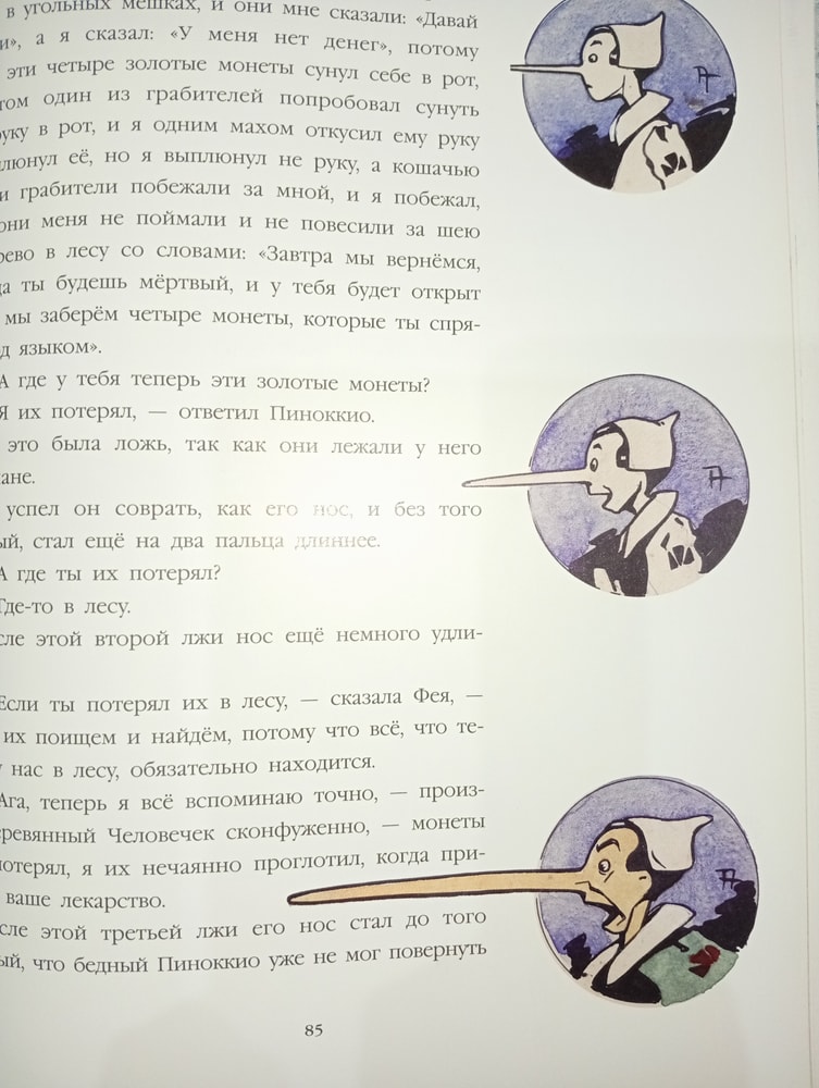 А какой рассудительный Пиноккио становится в конце своих приключений, говорит старым знакомым Лисе и Коту. «Ворованным добром не выстроишь дом. Краденая пшеница в еду не годится. Кто куртку ближнего загрёб, тот без рубахи ляжет в гроб».