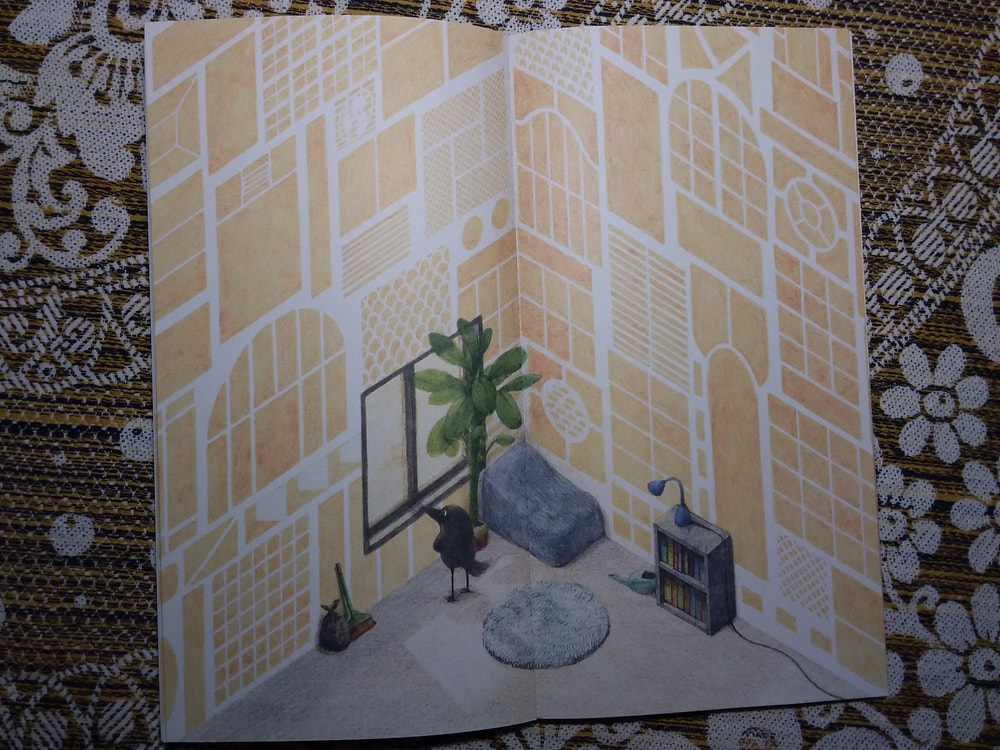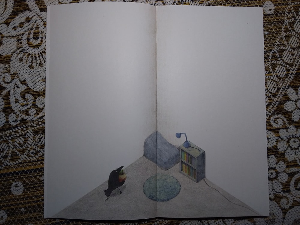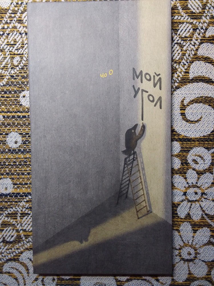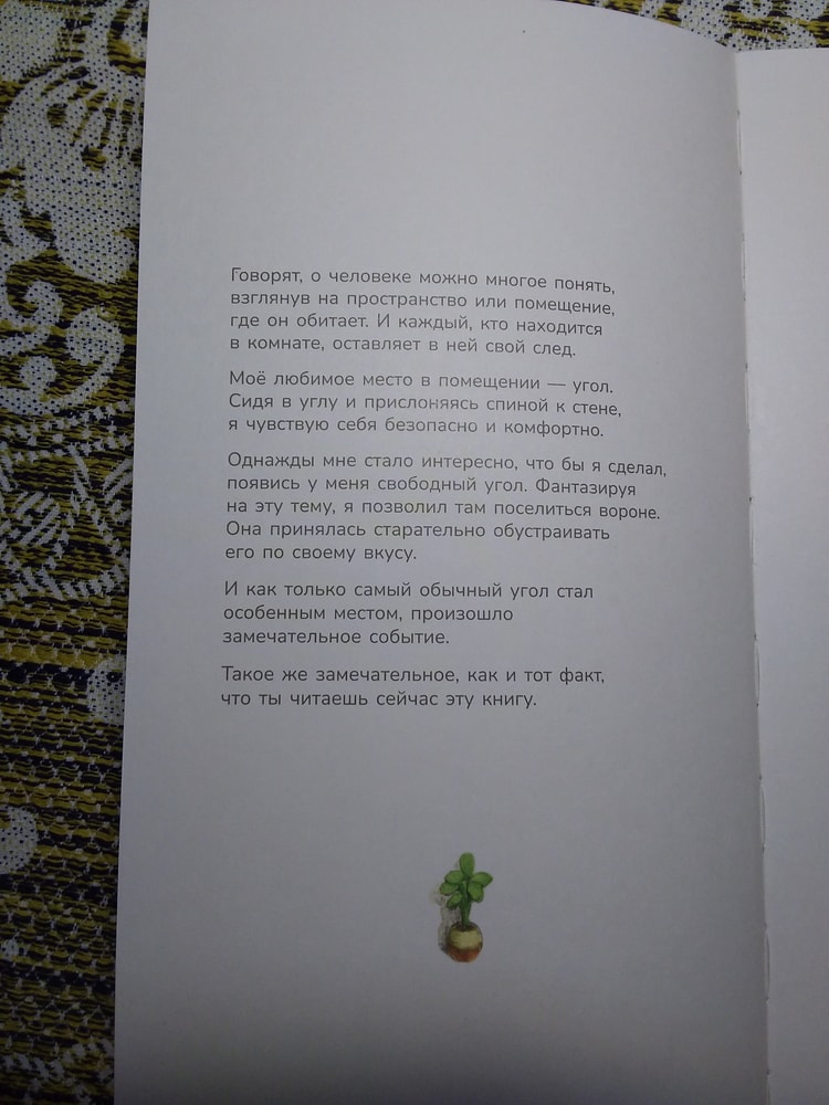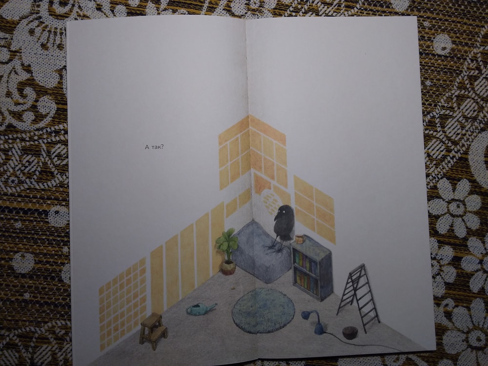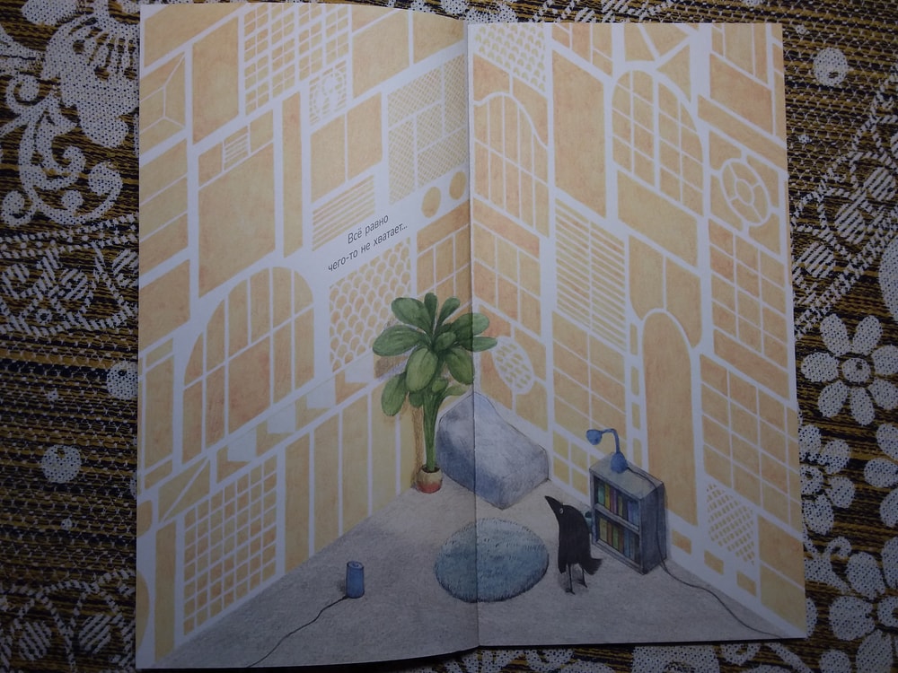 Действительно, ничего там особо нет. Книжка-картинка почти без слов, как ворон обживается в своём уголке, а мне от неё улыбаться хочется ). Начну с конца