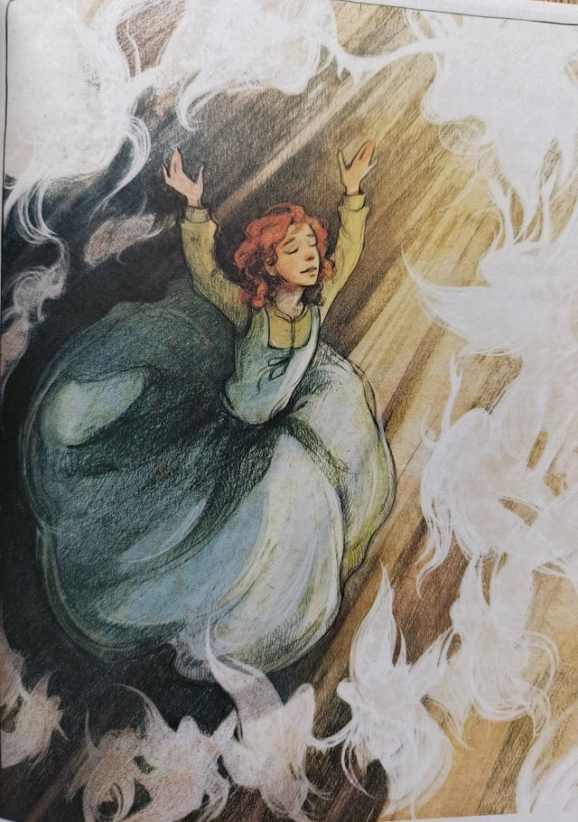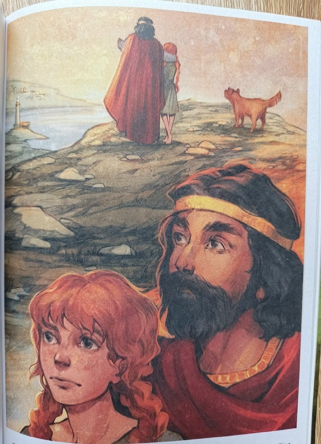 Она проходит унизительный и пугающий обряд, когда ее бреют наголо, раздевают, вешают на шею особый камень - и отдают королю...как женщину. Верховодит этим обрядом, проводимом в храме бога Семипряха страшная старуха в черном с брошью в виде веретена. Но в этот раз король остался без силы, поскольку Кьяра, прямо с камнем на шее, бросилась в море, предпочитая смерть вот этому всему. Но на шее у нее был кулон из маминой сережки, обладающий, как оказалось, особыми свойствами. Кьяру спас и вынес на берег огромный морской обитатель , древний туатлин.
