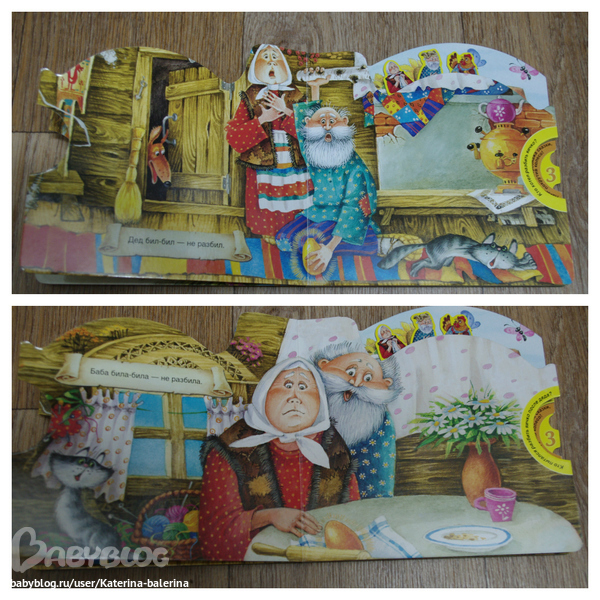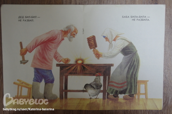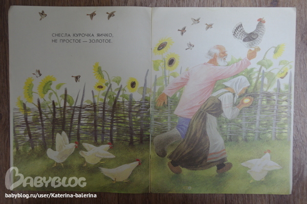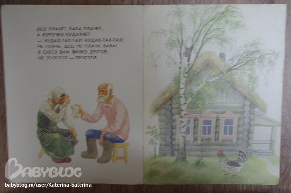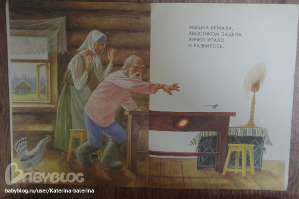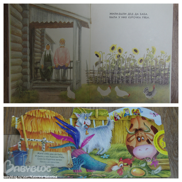 Достоинство советской книги в том, что ребенок срвзу видит то, о чем ему читают. Иллюстрации не отстают от текства и не опережают его. Ребенок пальчиком может показать деда, бабу, рядом курочку. Чтобы ребенок до года смог воспринять сказку картинка должна буквально описывать каждую строчку.
