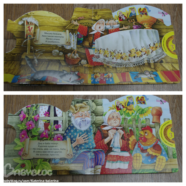В новой книжке много цвета и деталей, ребёнку трудно сосредоточиться и выделить главное. Не подумайте, я не ругаю эту книжку, на мой вкус, здесь картинки даже намного милее и привлекательнее. Оформление очень интересное, с подвижными элементами.Но! в этом исполнении книга подходит деткам которые уже знакомы со сказкой и её героями. "Курочка Ряба" чаще всего первая сказка у ребёнка. Нам сейчас 8 месяцев. Для такого малыша эта книга не подходит! Эта книга не для первого прочтения. Я купила её, т.к. мне хочется показать ей такие замечательные картинки, но читать я её буду немного позже, после классической книги. Моя Анюта играет с этой книгой, пробует на зуб, крутит-вертит, книга находится в свободном доступе. А вот старая книжка тонкая и это единственный существенный недостаток.