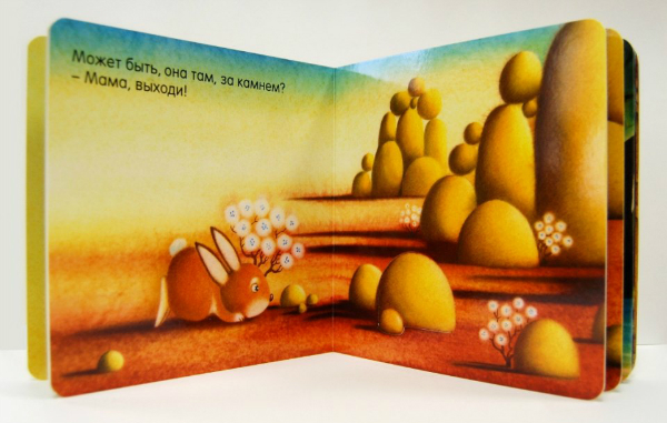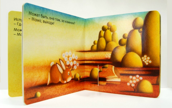 Зайчонок ищет свою маму. Может быть, она спряталась за камнем или прилегла отдохнуть в сарае? Ой-ой-ой, мамы нигде нет. Но вот она нашлась! Оказывается, мама хотела сделать малышу сюрприз.