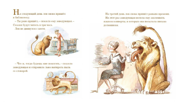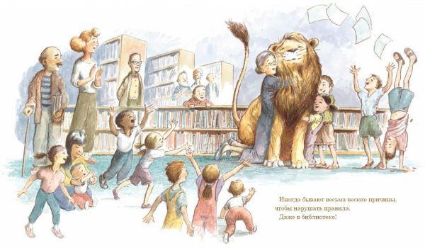 Заведующая библиотекой мисс Мерривезер очень трепетно относится к правилам. Бегать нельзя. Кричать нельзя. А когда однажды в библиотеку приходит настоящий лев, она не знает, что делать, ведь в правилах ничего об этом не сказано! Но оказывается, что лев - находка для библиотеки: его лапы тихо ступают по полу, на него, как на большой мягкий диван, усаживаются дети, когда слушают сказки.