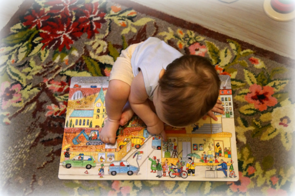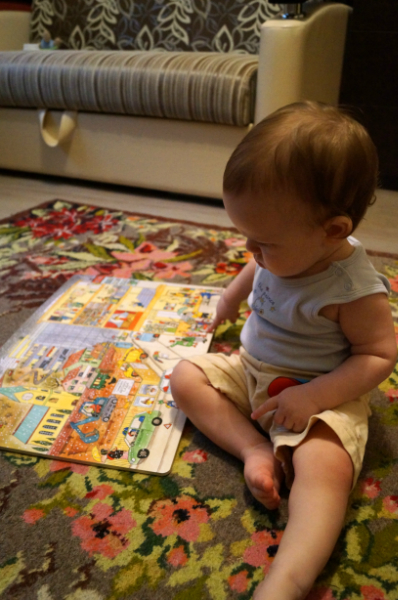 Первым делом тычет пальчиком в машинки и начинает забавно дрынчать)