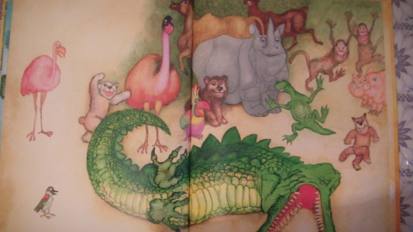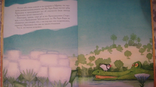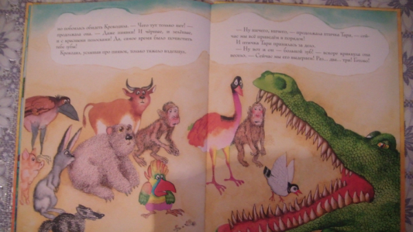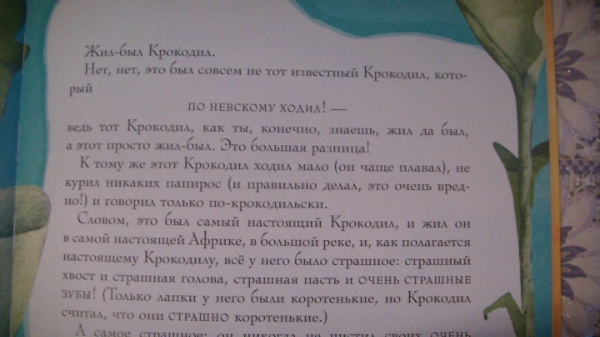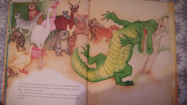 Давайте вспомним начало книги "Словом, это был самый настоящий Крокодил, и жил он в самой настоящей Африке..." Если место действия Африка, откуда там взялась свинья (домашнее животное), черепаха, заяц, ворона, утка, это только те, кого, я хоть как то смогла опознать. Да, кто-то скажет это всего лишь книга, а не энциклопедия, допустим, тогда зачем привязывать крокодила именно к Африке, крокодилы не только в Африке живут. Я просто за то, чтобы у ребенка складывалось изначально правильно представление и о животном мире в целом и о местах их обитания.