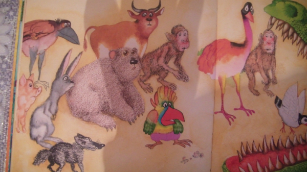 Во-вторых, не хочу обидеть поклонников творчества Геннадия Калиновского, но иллюстрации мне тоже не понравились по нескольким причинам: я не люблю, когда ты смотришь на персонажей и не можешь определить, что это за зверь такой нарисован. Прямо напрашиваются слова Пушкина "Родила царица в ночь не то сына, не то дочь; не мышонка, не лягушку, а неведому зверушку". Я конечно не исключаю, что у меня может не достаточные познания в определении видов животных, но когда у тебя ребенок спрашивает "Мам, а это кто?", а ты представления не имеешь КТО это...не очень хочется продолжать чтение, чтобы не чувствовать себя не ловко перед ребенком.