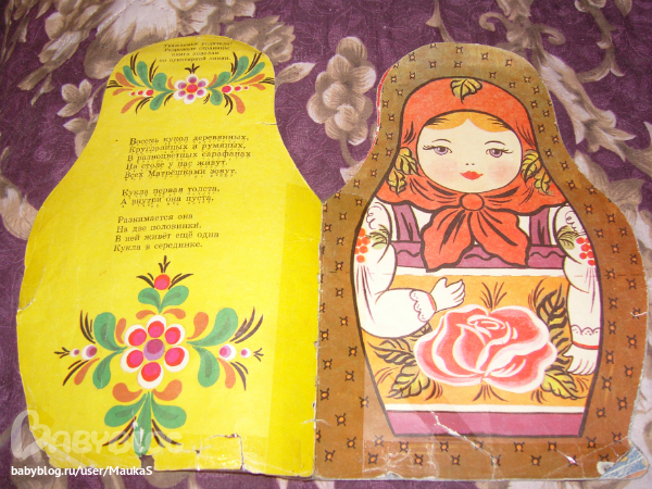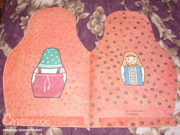 Матрешки. 1991 год издания. Но уже тогда были книжки-игрушки. В начале книжки написано обращение к родителям. Разрежте странички пополам по пунктиру. И тогда матрешки будут появляться одна за одной.
